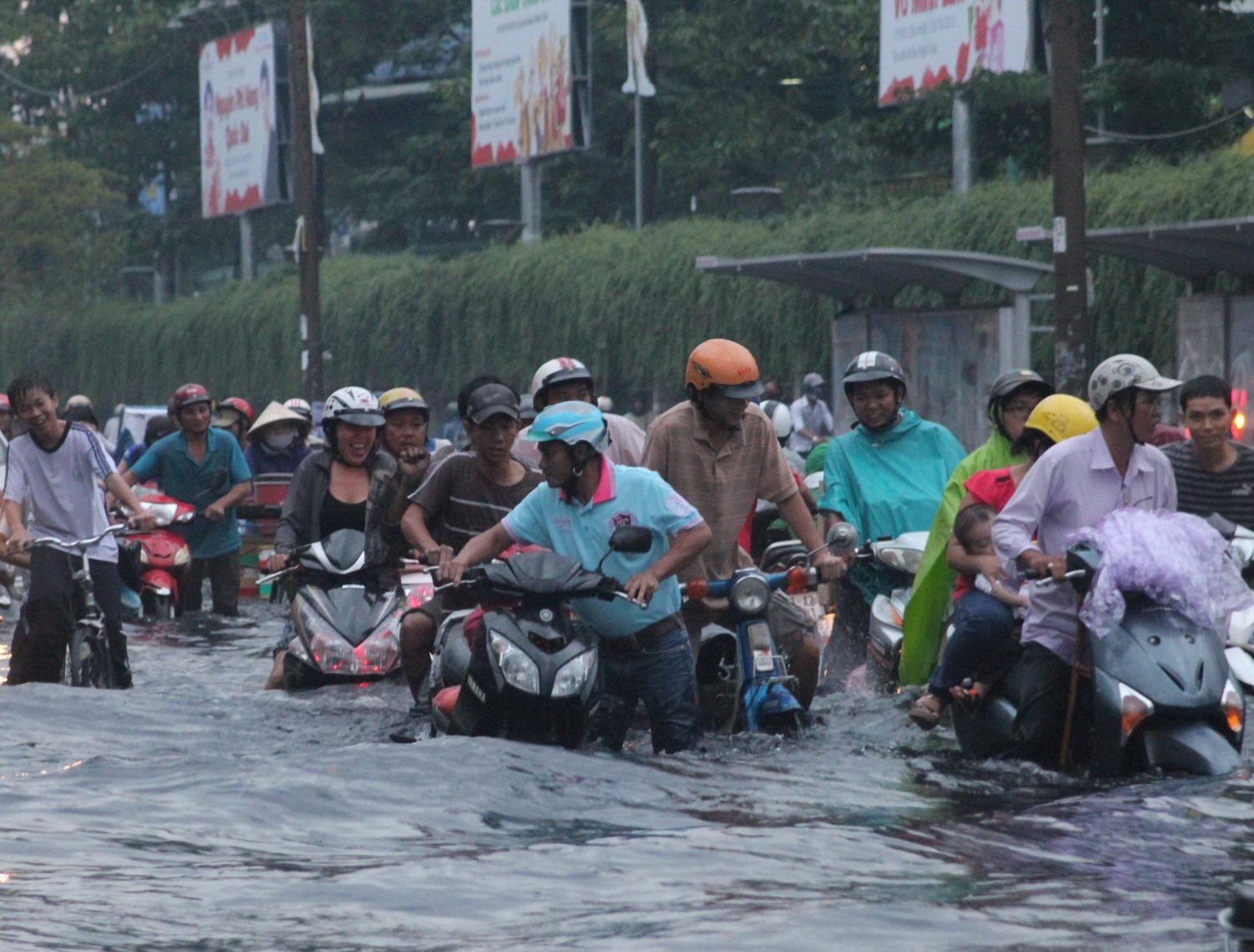 | Dòng người lũ lượt dắt xe chết máy vượt qua những đoạn ngập tại đường Hòa Bình, Q.11. |
