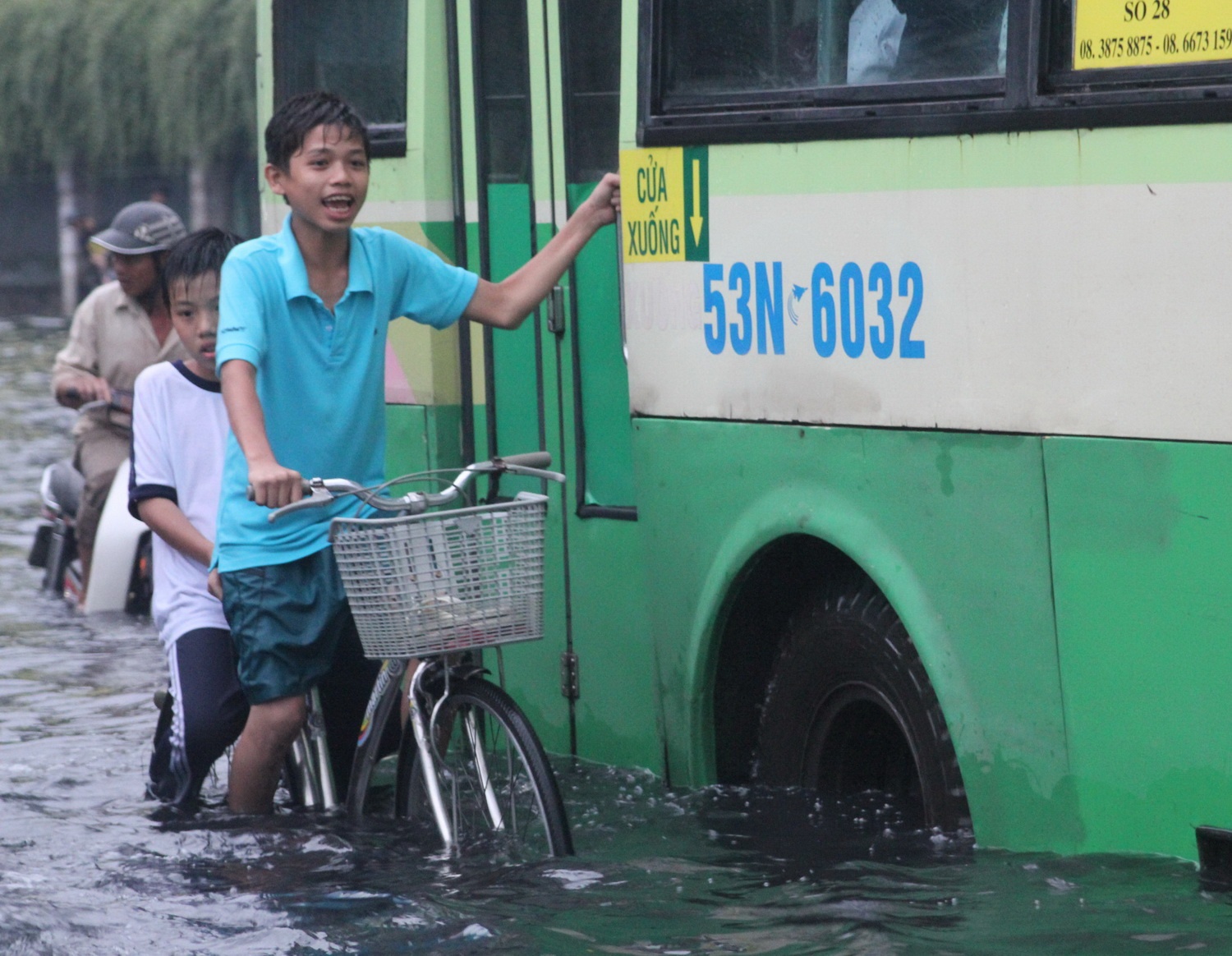 | Hai cậu bé "nhờ" xe buýt kéo qua đoạn đường ngập. |