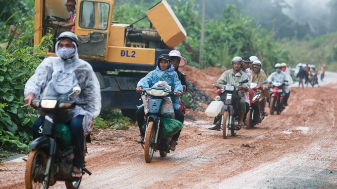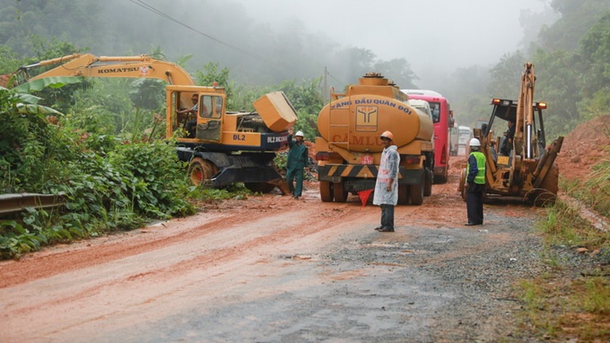 Tại hiện trường tính đến 15h, hàng chục công nhân vẫn đang giải quyết tình trạng sạt lở trong điều kiện sương mù và mưa. Hai chiếc cần cẩu, một máy ủi đã được huy động để dọn dẹp đất phủ trên mặt đường. Hàng trăm xe cộ cả hai hướng Nha Trang - Đà Lạt nối đuôi nhau, chờ đợi 10-15 phút tới lượt lưu thông qua đoạn đường sạt lở này.