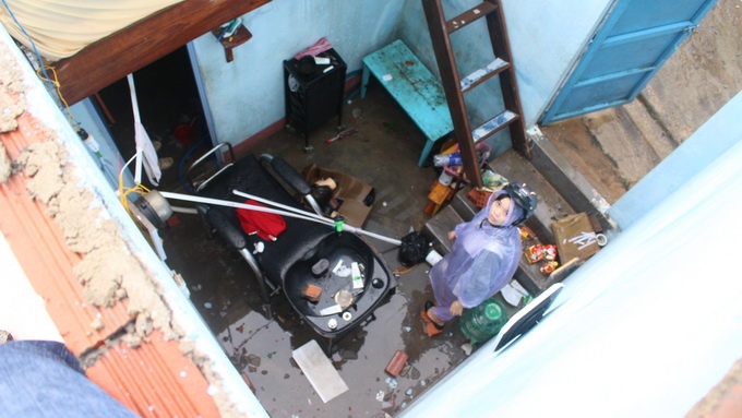 | Mái nhà của một hộ dân xã Hiệp Thạnh bị cuốn bay hoàn toàn. |