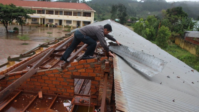 Đến chiều 7/11, hàng chục nhà dân và trường học bị tốc mái do mưa lớn kèm gió mạnh gây ra đêm 6/11 tại xã Hiệp Thạnh, huyện Đức Trọng (Lâm Đồng) vẫn chưa sửa chữa xong dù đã được lực lượng chức năng huyện hỗ trợ.