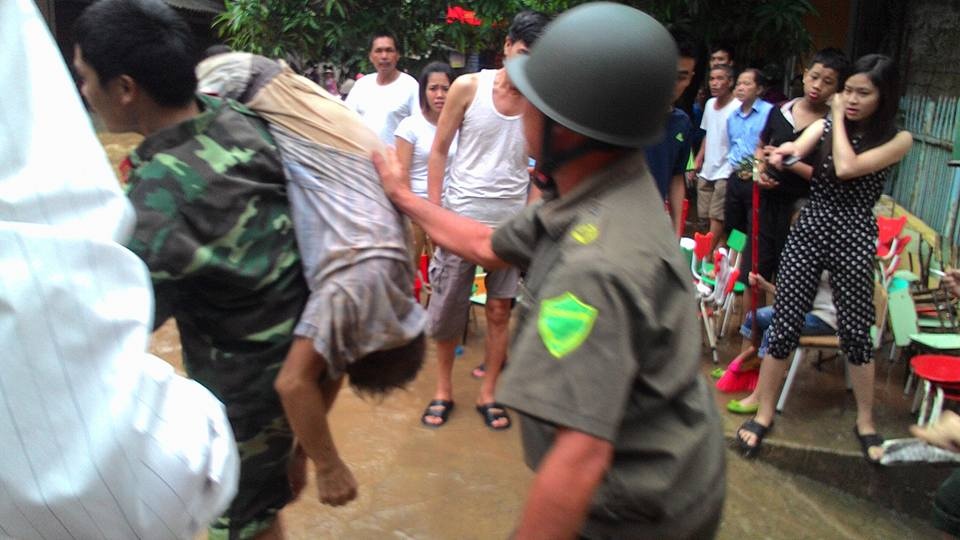 | Theo nhân chứng, sáng cùng ngày, do nước lũ mênh mông khắp các tuyến phố, một ông cụ 70 tuổi đi bộ hụt xuống cống thoát nước. Người này bị nước lũ cuốn đi. Người dân hô hoán cùng lực lượng dân phòng tìm cách giải cứu. Sau 10 phút, ông cụ mới được kéo lên khi đã bất tỉnh. Lực lượng cứu hộ đưa nạn nhân vào bệnh viện thị trấn cấp cứu. Ảnh: Triệu Vương. |