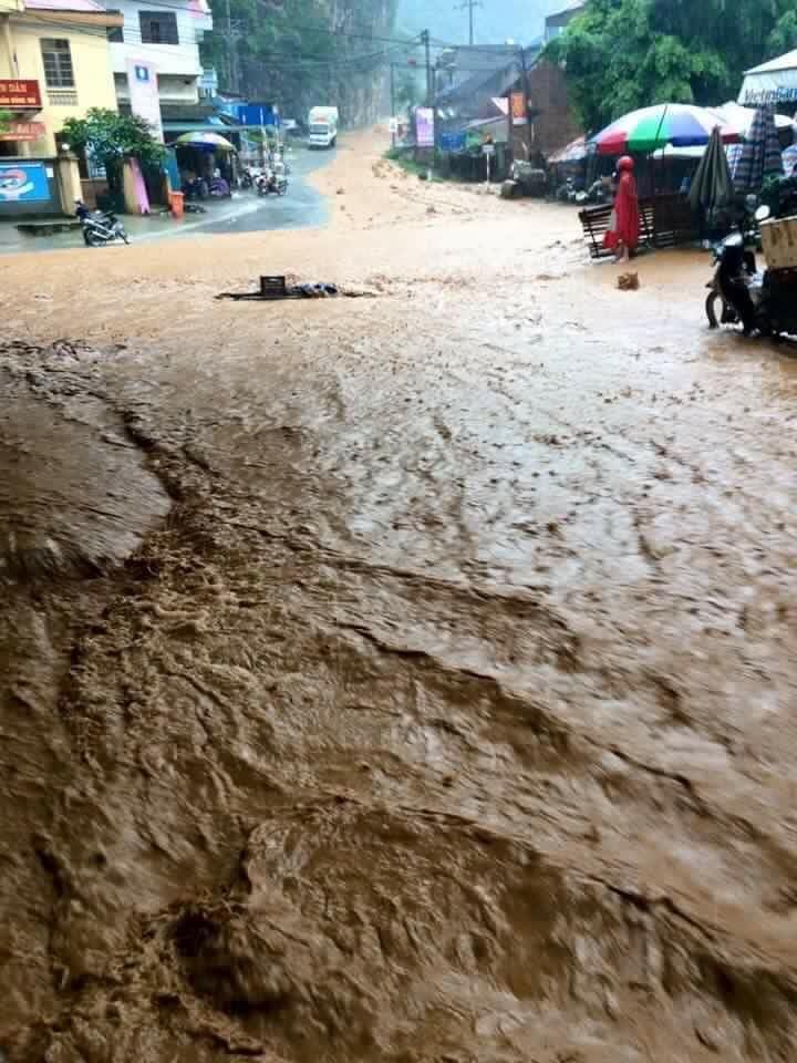 | Các tuyến phố ở thị trấn Đồng Mỏ ngập sâu trong biển nước. Ảnh: Facebook Gửi Kính. |