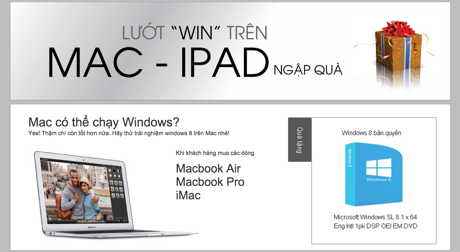 Một nhà bán lẻ lớn tại TP.HCM đang triển khai chương trình "lướt win trên MacBook". Đây là chiêu khuyến mãi lạ chưa từng có tại Việt Nam. Cụ thể, mỗi khách hàng mua Macbook Air, Macbook Pro hay iMac chính hãng sẽ được tặng kèm bản quyền hệ điều hành Windows 8.1 SL 64 bit.