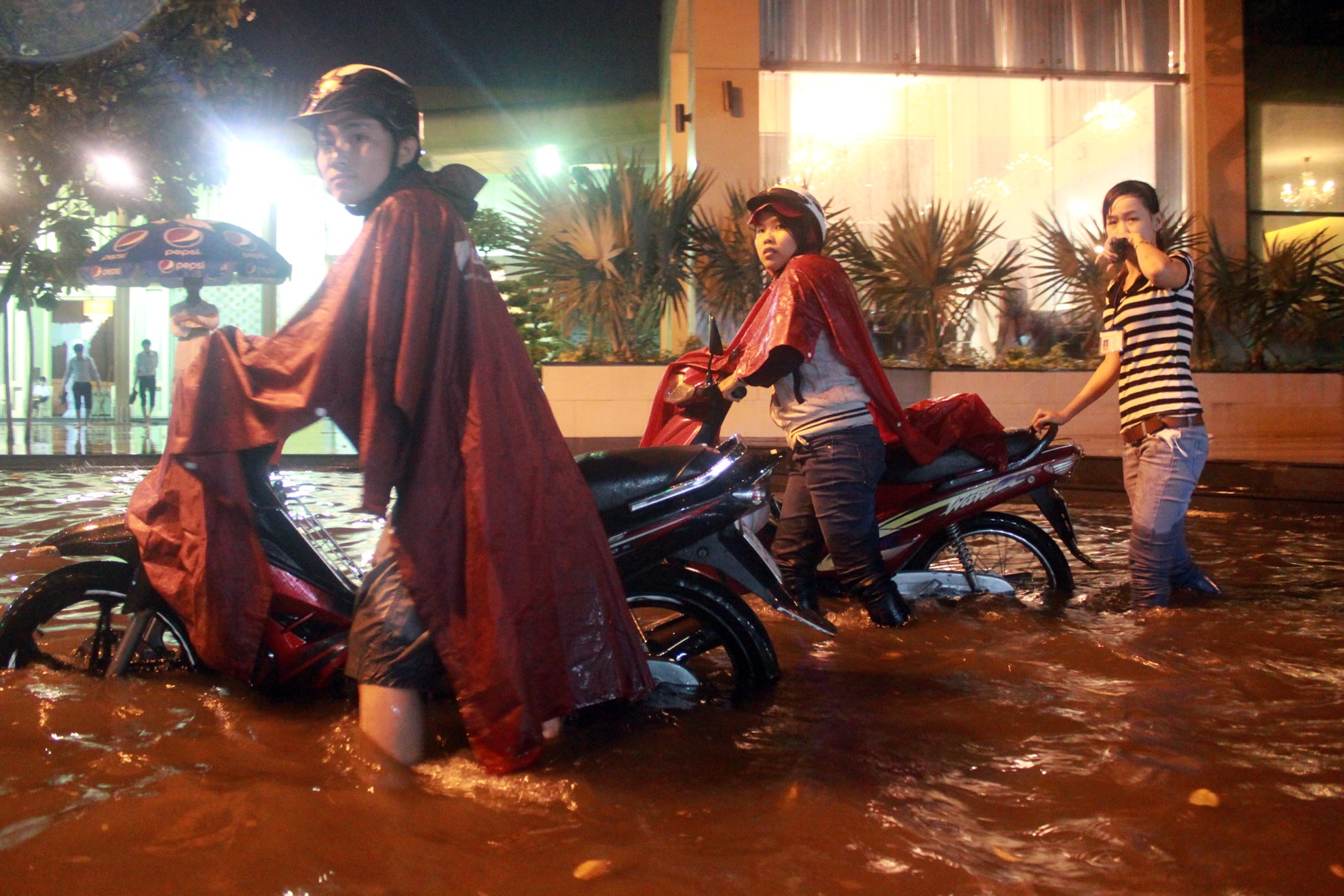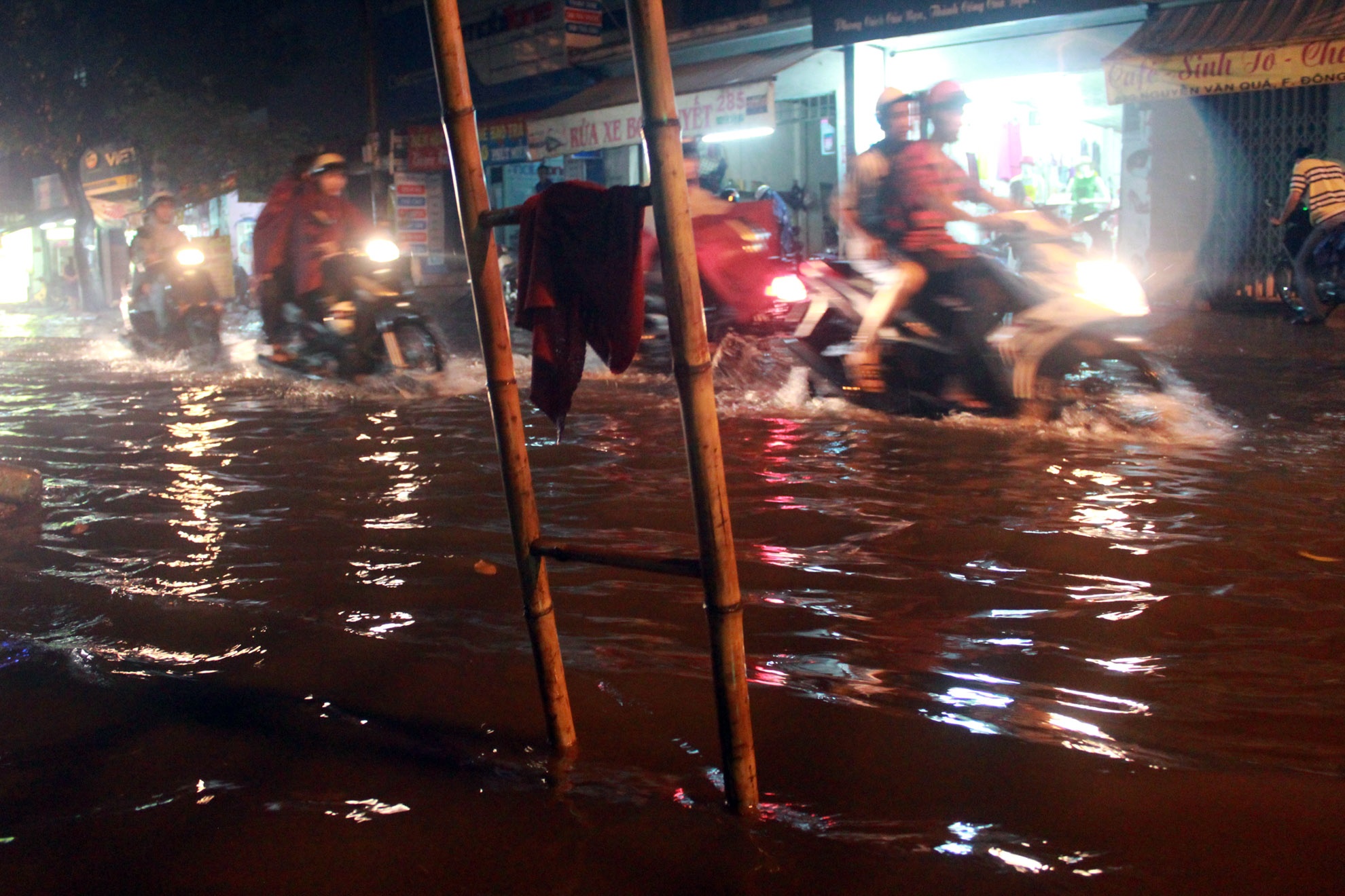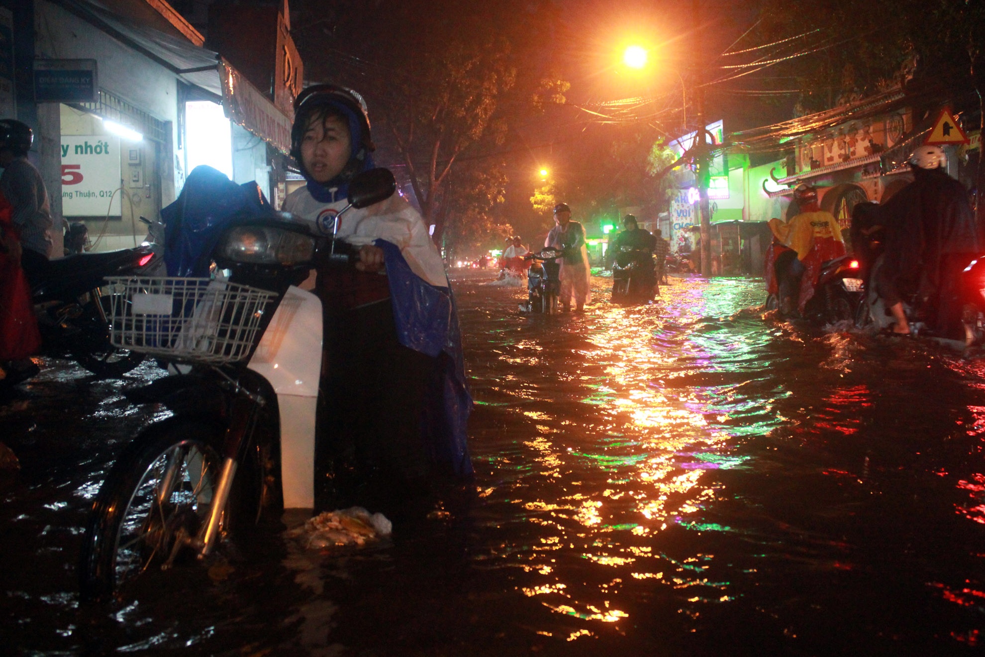 | Cơn mưa lớn kéo dài khoảng 1 giờ, từ 17h30 chiều tối nay ở khắp các quận, huyện trên địa bàn TP.HCM đã khiến nhiều tuyến đường, nhà dân bị ngập nặng. Do mưa lớn xảy ra vào giờ đi làm về nên rất nhiều người bị ướt sũng, bì bõm lội nước dắt xe chết máy về nhà. Ảnh: Lê Quân |