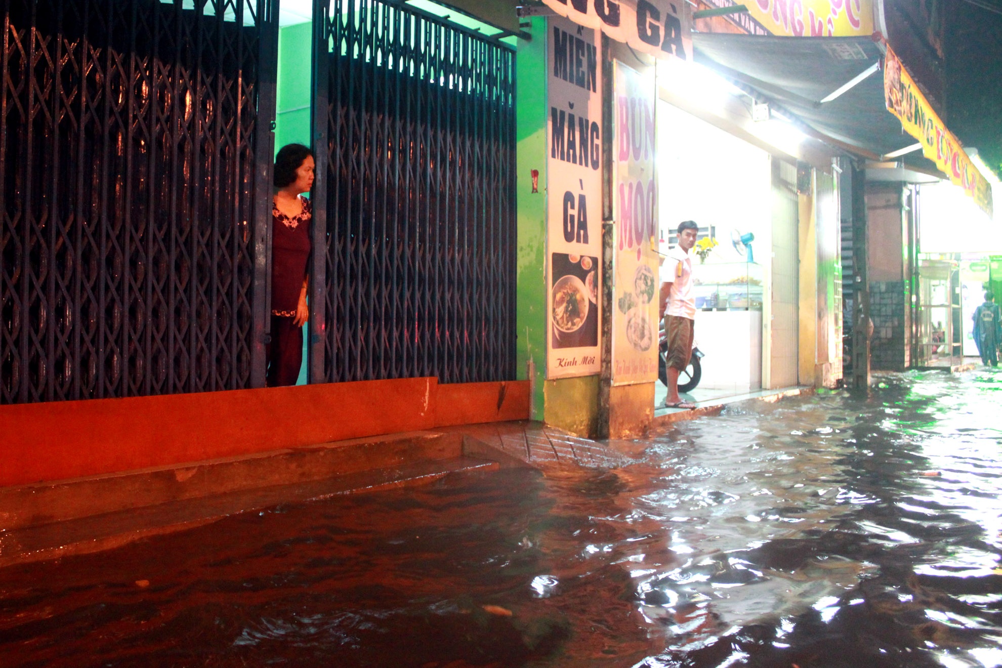 | Nước mưa đổ dồn về những đoạn đường thấp trũng khiến các hộ dân ở hai bên đường phải dùng các tấm chắn, bao cát... để ngăn nước tràn và sóng đánh vào nhà. Trong ảnh, người dân hai bên đường Nguyễn Văn Quá, quận 12 đứng nhìn biển nước sau khi dựng rào chắn ngăn nước vào nhà. Ảnh: Lê Quân. |