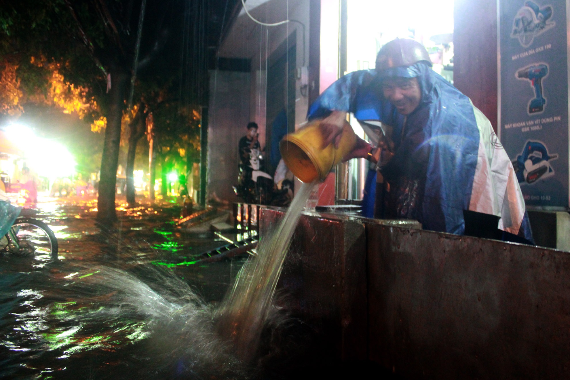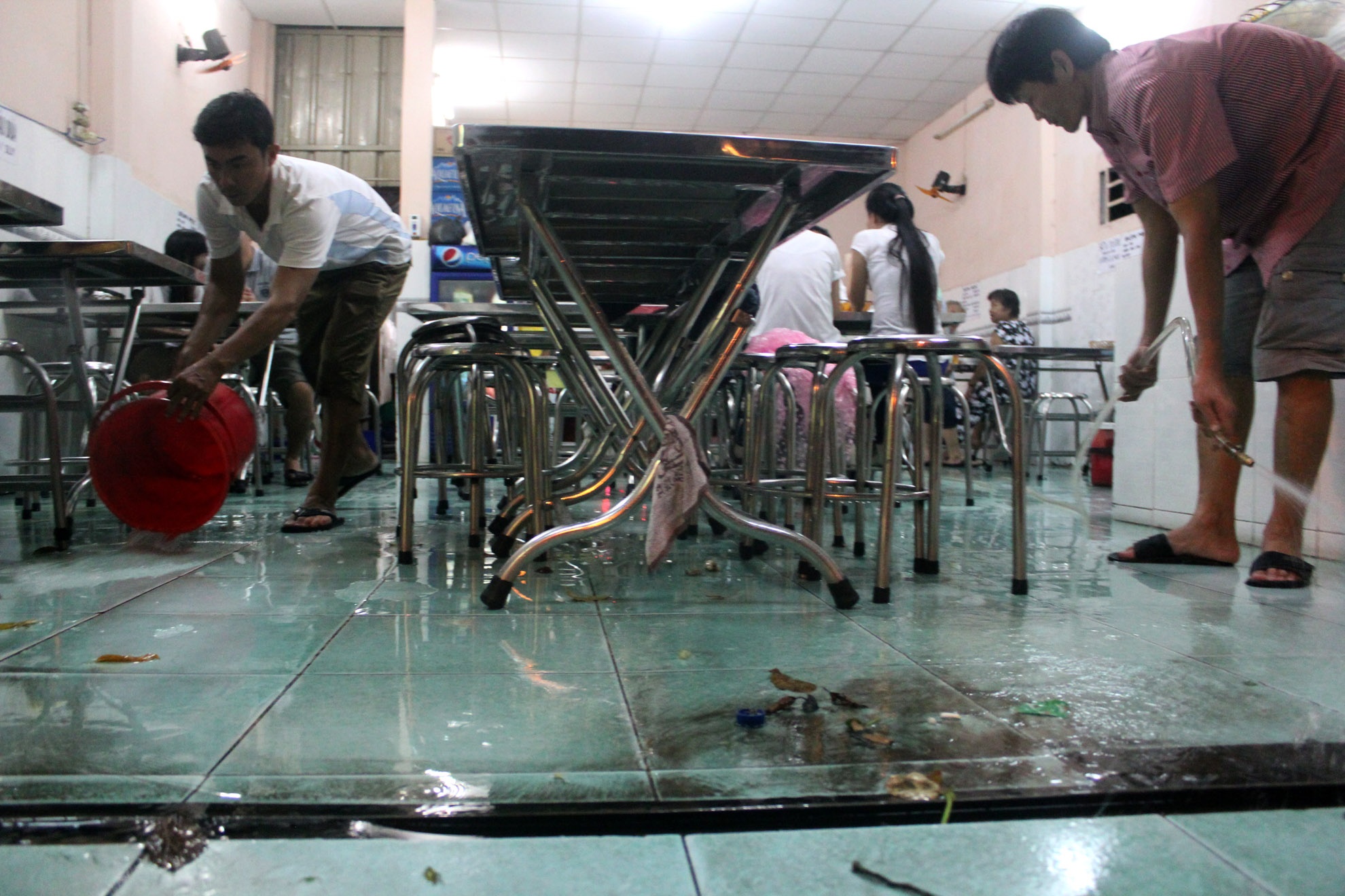 | 19h30 khi nước rút, nhiều quán hai bên đường bắt đầu dọn rác và bùn bẩn do nước ngập đẩy vào. Ảnh: Lê Quân. |