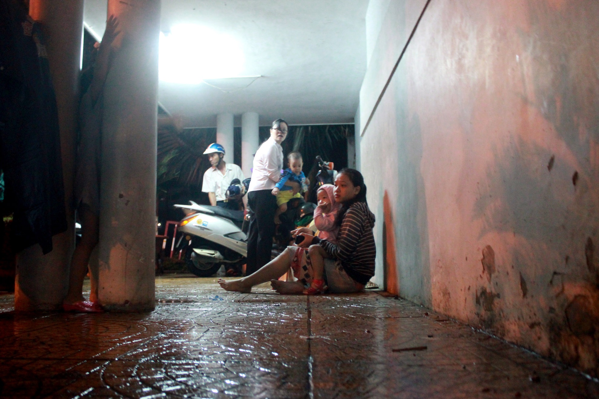 | Một số phụ huynh đón con nhỏ từ trường mẫu giáo trên đường Nguyễn Văn Quá đành ngồi bên đường chờ nước rút. Ảnh: Lê Quân. |
