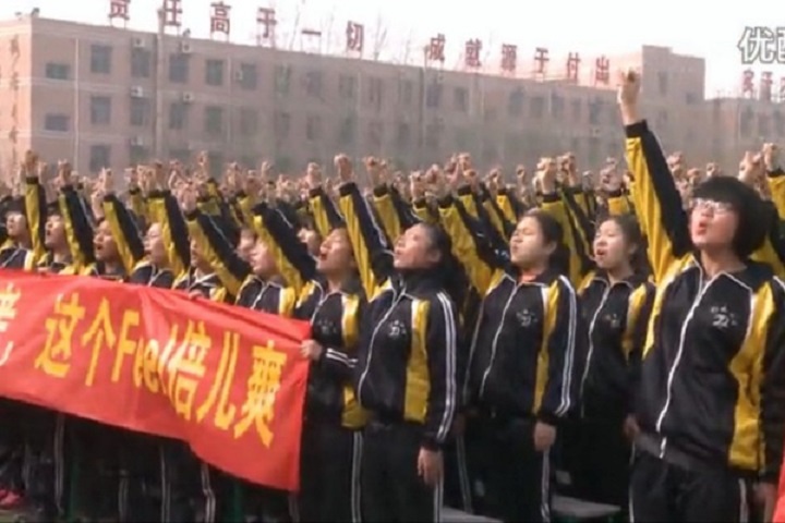 | Học sinh thể hiện ý chí và quyết tâm vượt qua kỳ thi Gaokao, bước chân vào cổng trường đại học mơ ước. Họ hô vang khẩu hiệu: "Em nhất định thành công", "Chúng em sẽ mang lại vinh quang cho nhà trường" và "Vì đại học, vì danh dự, vì cha mẹ, vì thầy cô, cố lên, cố lên, cố lên!". Ảnh: chinaSMACK. |