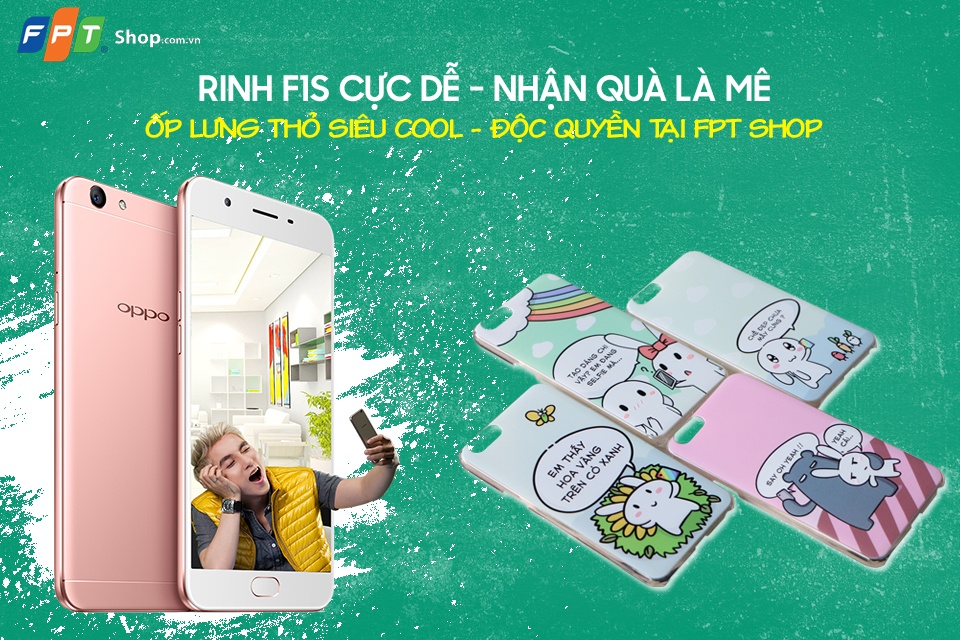 | Chọn mua điện thoại OPPO tại FPT Shop, khách hàng có cơ hội trúng một trong 50 máy F1s. Đồng thời, người mua sẽ được tặng cặp ốp lưng thỏ bảy màu độc đáo khi mua OPPO F1s. |