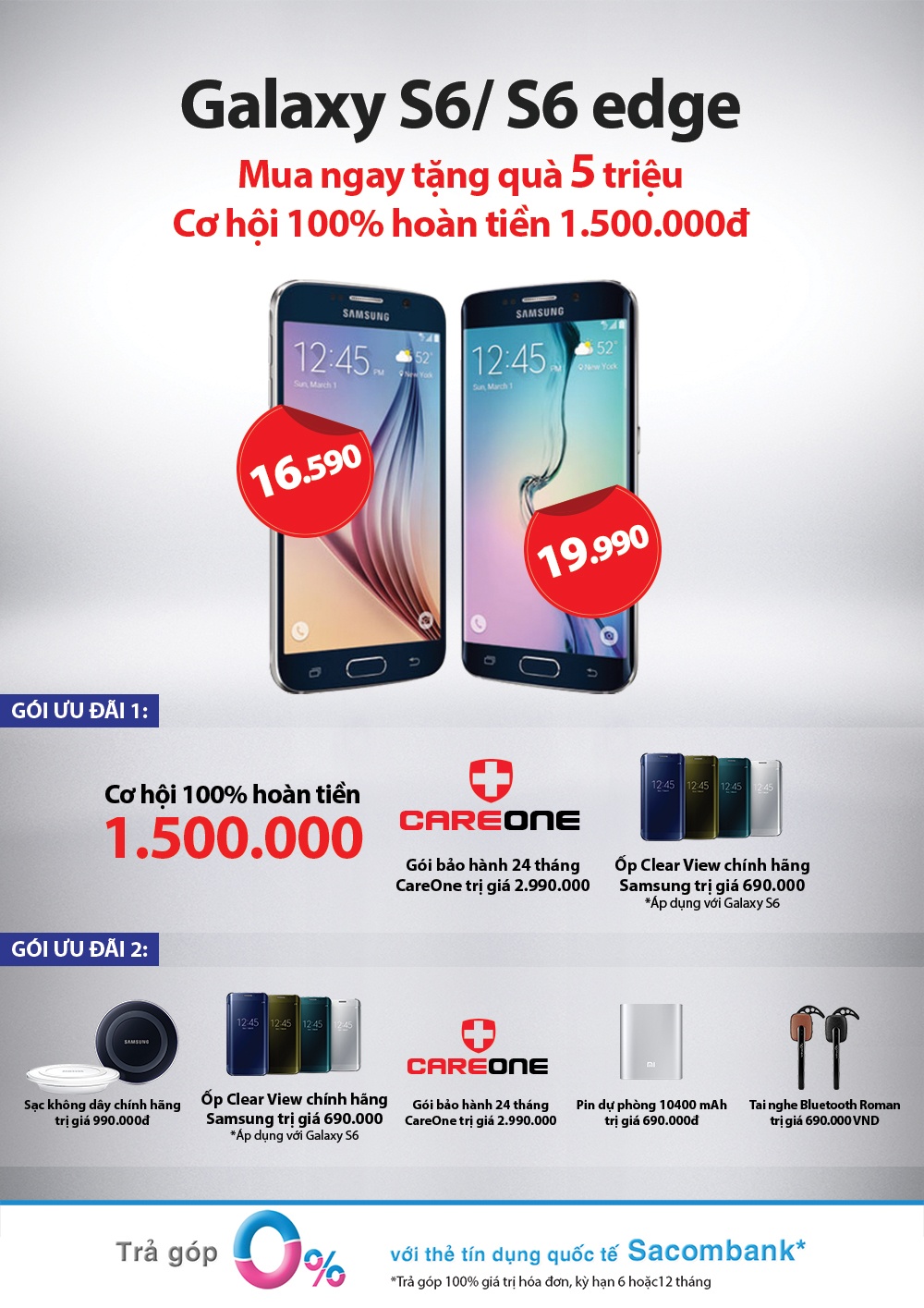 - Trả góp 0% lãi suất ACS - miễn phí toàn bộ lãi suất, số tiền phải trả trước chỉ 50%. Theo đó, với Galaxy S6 số tiền trả trước là chưa đến 8,3 triệu đồng, hàng tháng trả gần 1,4 triệu đồng. Còn Galaxy S6 Edge trả trước gần 10 triệu đồng, hàng tháng góp gần 1,7 triệu đồng. Khi sử dụng dịch vụ bán hàng từ xa, TechOne miễn phí vận chuyển, độc giả có nhu cầu liên hệ 1900 6666 hoặc 0125 941 5555. Nếu muốn mua trả góp, liên hệ 0123 537 5555.