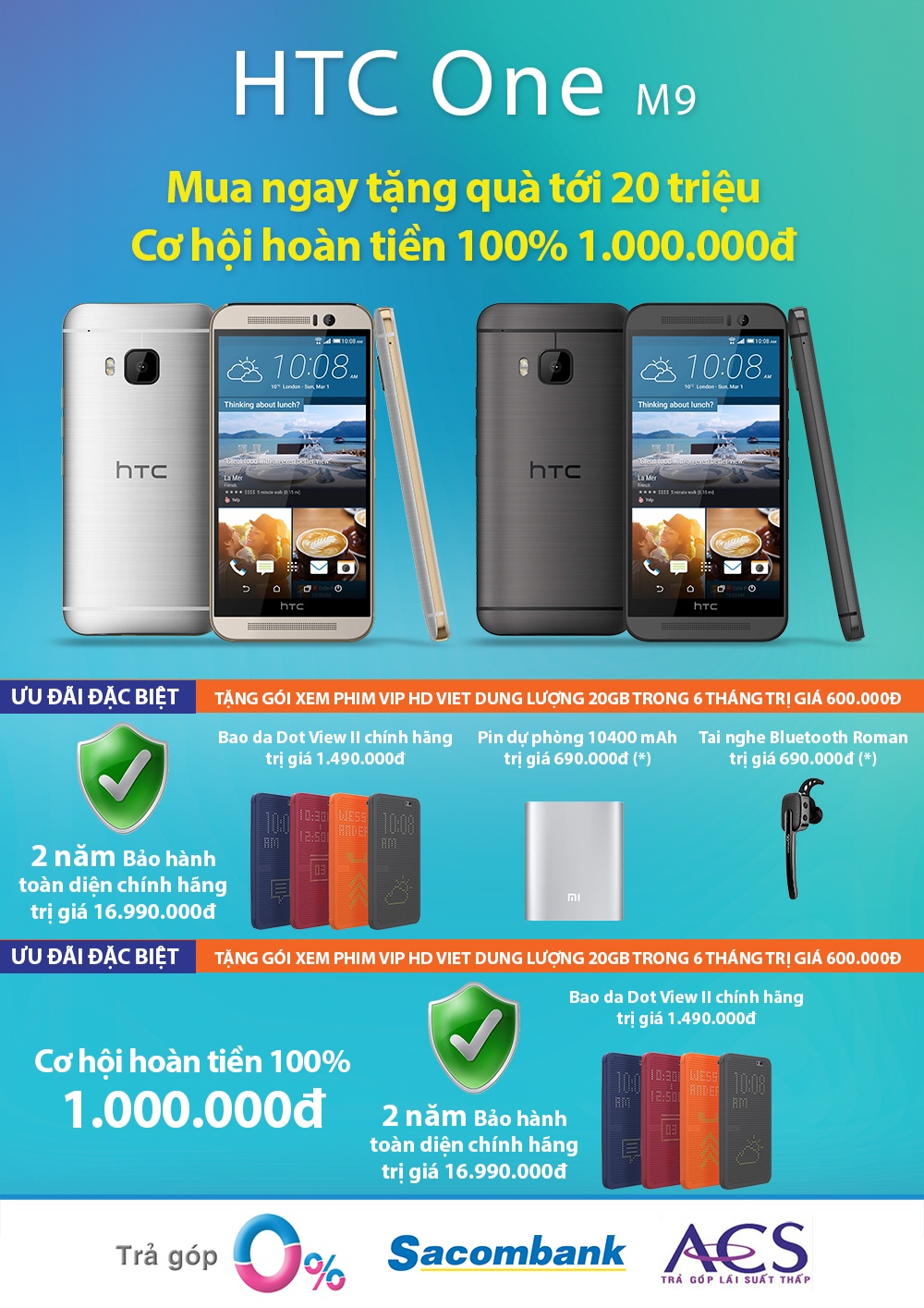 - Gói bảo hành toàn diện 24 tháng chính hãng HTC 16,99 triệu đồng