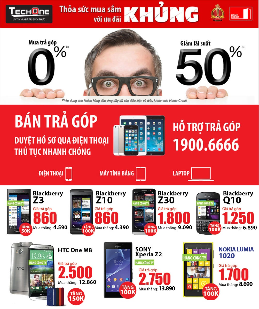 Một trong những cách chi tiêu thông minh nhất tại giai đoạn kinh tế khó khăn như hiện nay là mua hàng trả góp. Thấu hiểu điều đó, TechOne, hệ thống siêu thị di động chính hãng, luôn cố gắng tối đa để hỗ trợ khách hàng. Là hệ thống uy tín và luôn nhận được sự tin tưởng của người tiêu dùng, sự ủng hộ của các đối tác kinh doanh, phân phối là lý do để công ty luôn có thể cung cấp cho khách hàng những dịch vụ tốt, giá rẻ, và khuyến mại ngập tràn. Mừng tháng khai trương chuỗi 3 siêu thị thứ 8 thứ 9 và thứ 10 tại TP.HCM, hãng triển khai chương trình trả góp ưu đãi cực lớn. Quý khách chỉ cần thanh toán trước 20% giá trị máy đã có thể dễ dàng sở hữu ngay sản phẩm yêu thích chỉ với 10 phút duyệt hồ sơ. Thủ tục đơn giản: