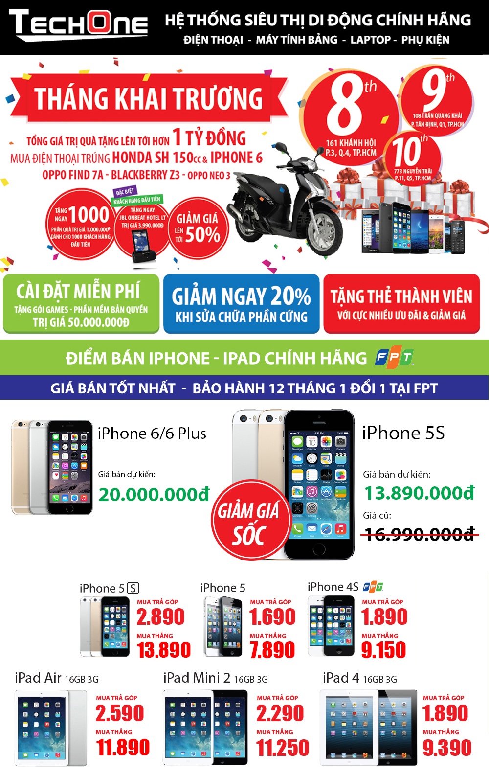 Nhân tháng khai trương TechOne triển khai chương trình bốc thăm trúng thưởng. Theo đó khách hàng đến mua sắm sản phẩm bất kỳ trên toàn hệ thống sẽ được nhận phiếu bốc thăm cơ hội trúng xe máy SH 150cc, iPhone 6, OPPO Find 7A, OPPO, Neo 3 và Blackberry Z3 cùng hàng nghìn giải thưởng hấp dẫn khác. Tổng giá trị quà tặng lên tới 1 tỷ đồng.