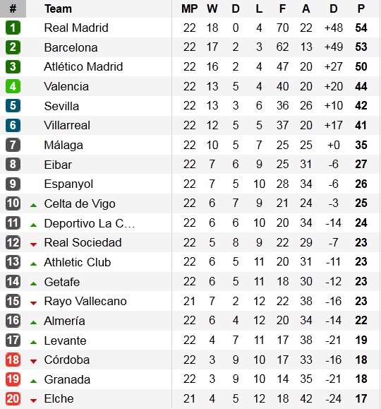 Bảng xếp hạng vòng 22 La Liga 2014/15.