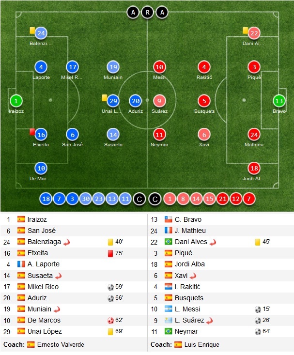 Sau khi Aduriz ghi bàn thẹp khoảng cách xuống 2-4 ở phút 66, Bilbao bị đẩy vào thế thiếu người. Etxeita nhận thẻ đỏ trực tiếp ở phút 75 vì phạm lỗi nguy hiểm với Suarez.
