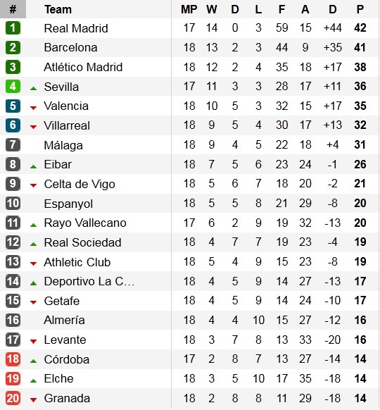 | Bảng xếp hạng vòng 18 La Liga 2014/15. |