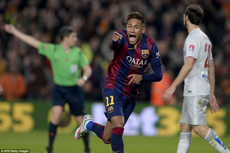 Phút 12, đường căng ngang của Messi đưa bóng đập chân Suarez và một cầu thủ khách trước khi đến vị trí của Neymar. Ngay lập tức tiền đạo người Brazil tung ra cú sút quyết đoán mở tỷ số cho Barca.