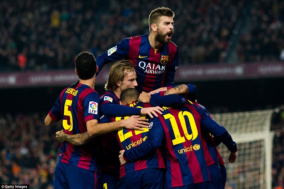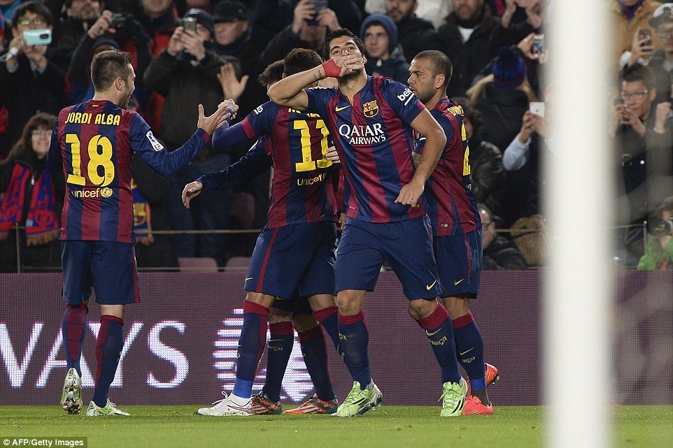 | Đội hình thi đấu: Barcelona (4-3-3): Bravo; Alves, Pique, Mascherano, Alba; Iniesta, Busquets, Rakitic (Rafinha); Neymar, Messi, Suarez (Pedro). Atletico Madrid (4-2-3-1): Moya; Juanfran, Godin, Gimenez, Gamez (Siqueira); Gabi (Torres), Tiago; Koke, Griezmann (Garcia), Arda, Mandzukic. |