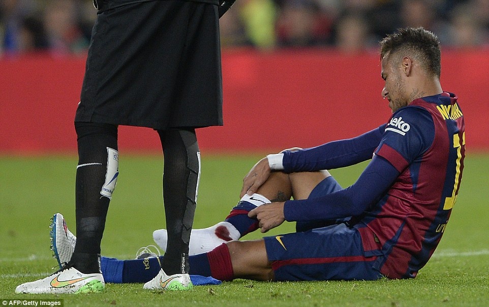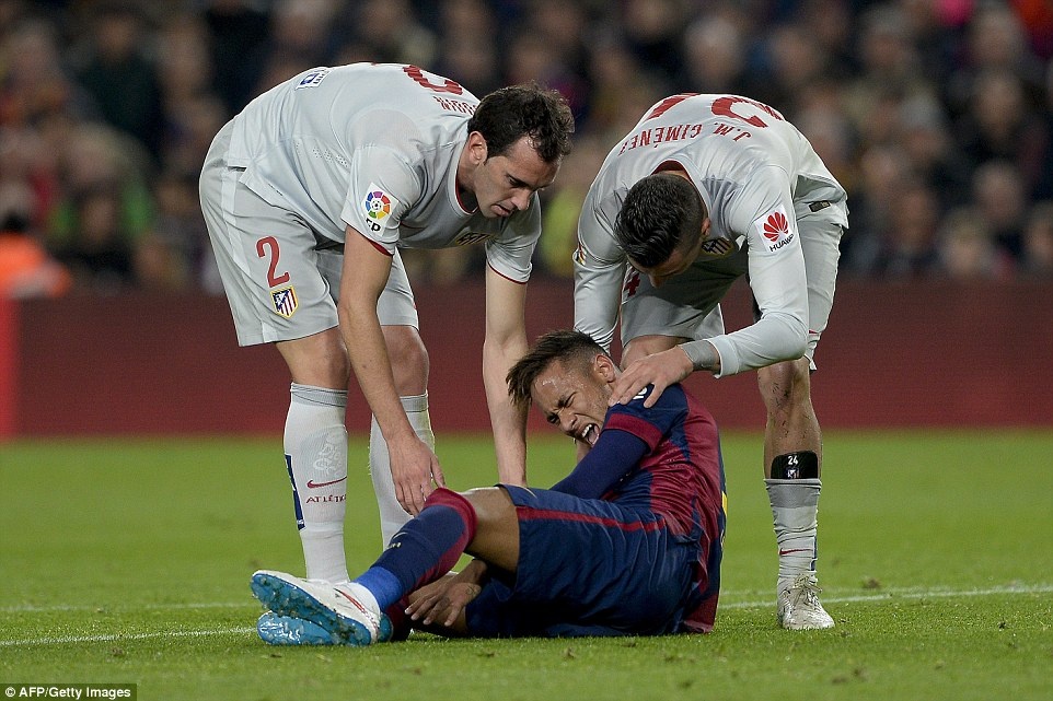 | Neymar bị đau sau pha vào bóng của Gimenez ở phút 17. |