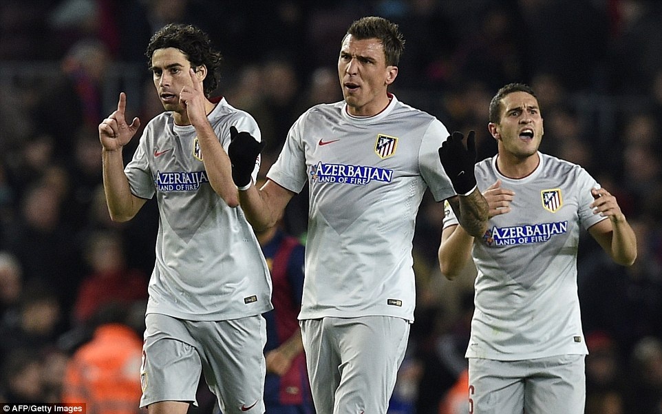 | Đây là một tình huống gây tranh cãi, bởi các cầu thủ Atletico cho rằng Messi để bóng chạm tay trước khi chuyền cho Suarez lập công. |