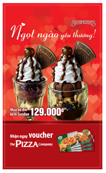 Với tên gọi Ngọt ngào yêu thương, cặp đôi kem cho chàng và nàng này là kem chocolate trộn những mẩu bánh Oreo giòn tan, chuối, được trang trí bằng tháp kem tươi (whipped cream) trắng mịn rưới sốt chocolate kèm bánh waffle giòn tan. Chocolate angel trong ly pha lê trắng kiêu sa cho nàng và ly chocolate heaven trong ly pha lê vàng, sang trọng cho chàng. Đặc biệt, khi “order” combo này các cặp đôi sẽ được tặng thêm 1 phiếu quà tặng trị giá 50.000 đồng, sử dụng tại nhà hàng The Pizza Company. Đây là một món quà đặc biệt của thương hiệu dành cho những người yêu nhau nhân mùa lễ hội tình yêu đặc biệt này. Combo kèm phiếu quà tặng có mức giá chỉ 129.000 đồng và mức giá siêu dễ chịu này sẽ áp dụng từ 8/2 đến 8/3/2015.