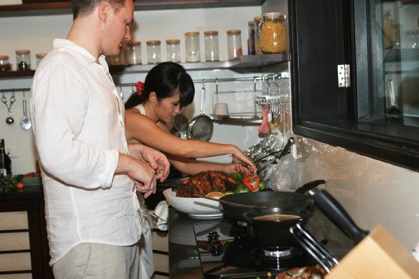 | Chồng Hồng Nhung cũng thường xuyên vào bếp để giúp vợ nấu ăn. |