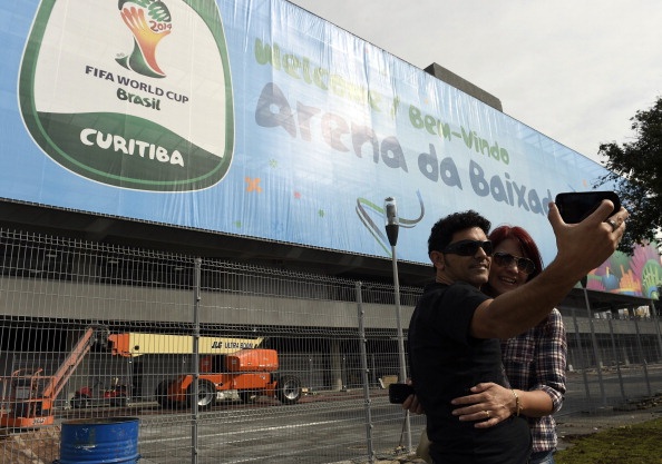 | Người hâm mộ chụp ảnh 'tự sướng' trước băng rôn hoành tráng World Cup 2014 nhưng phía dưới là ngổn ngang máy móc, vật liệu xây dựng của một số hạng mục mà nước chủ nhà chưa kịp hoàn thành. |