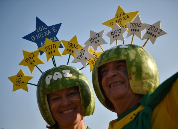 | Dù đã lớn tuổi nhưng đôi vợ chồng nước chủ nhà Brazil vẫn rất độc đáo với 2 chiếc mũ được làm từ dưa hấu - loại quả đặc trưng của đất nước nhiệt đới. Phía trên họ trang trí 5 ngôi sao với số năm mà đội nhà đã giành chức vô địch World Cup. |