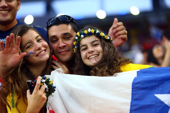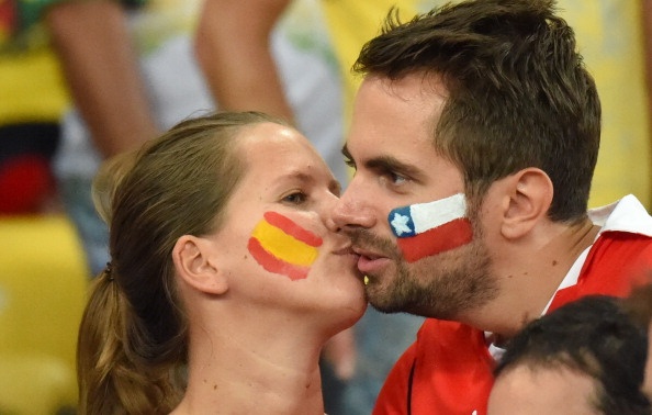 | Nụ hôn cháy bỏng của fan Chile trong trận đội nhà loại đương kim vô địch Tây Ban Nha khỏi World Cup 2014 với chiến thắng 2-0. |