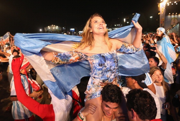 | Fan Argentina ăn mừng sau bàn thắng vàng của Messi vào lưới Iran. |