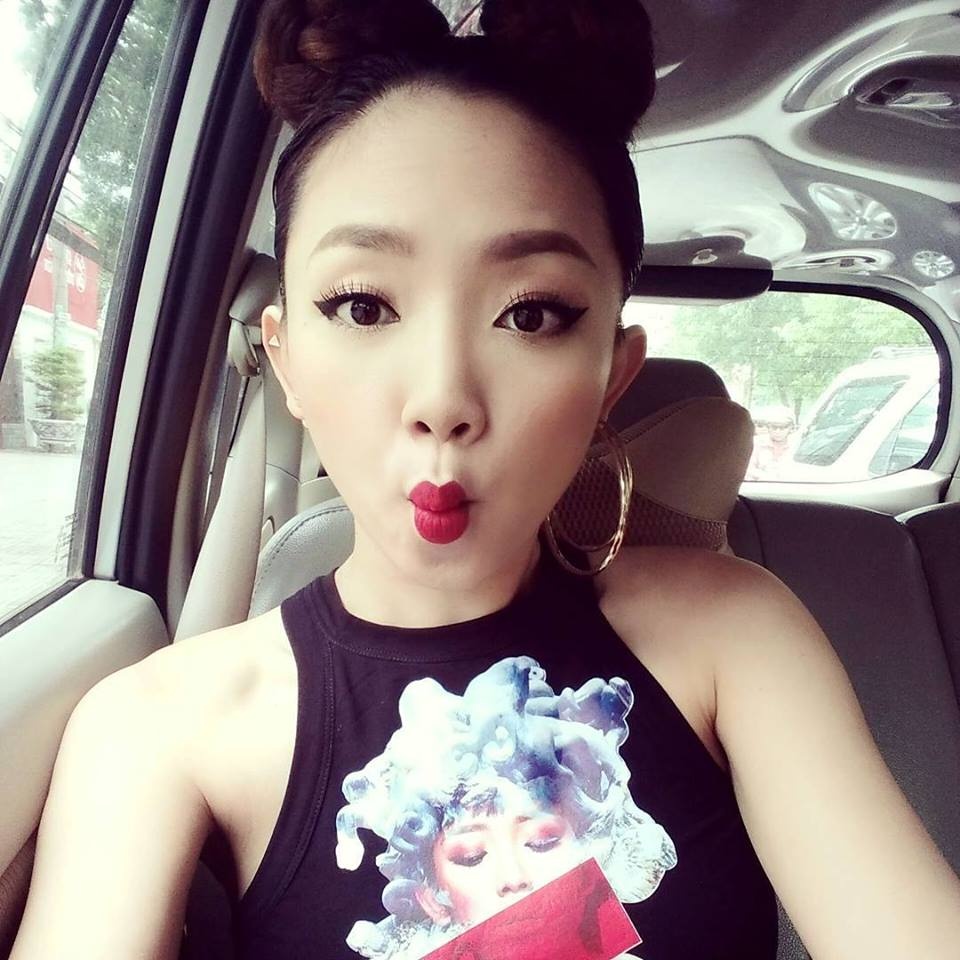 | Tóc Tiên để tóc kiểu tai chuột và chu mỏ khi chụp hình selfie. |