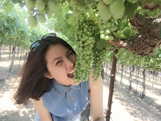 | Vân Trang chụp ảnh khi tới thăm một vườn nho. |