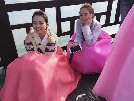 | Jennifer Phạm tạo dáng bên Minh Hằng khi tới Hàn Quốc. |