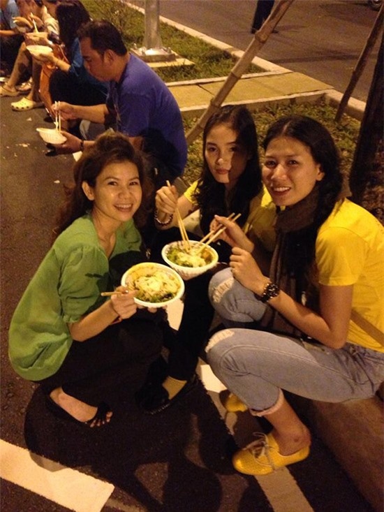 | Trang Trần cùng các thành viên trong đoàn từ thiện ăn vỉa hè trên đường ra miền Trung trao quà cho người dân gặp khó khăn sau bão lũ. |