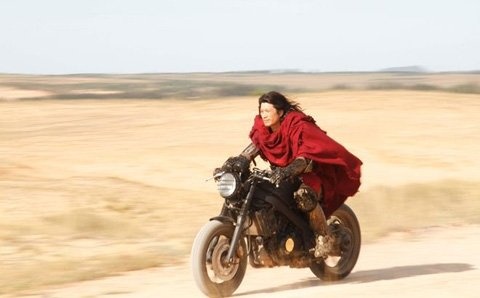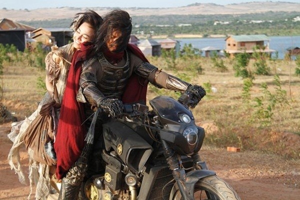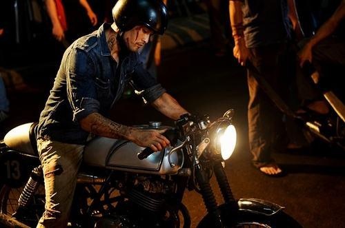 | Dustin Nguyễn phong trần với mô-tô hầm hố trong Lửa Phật. |