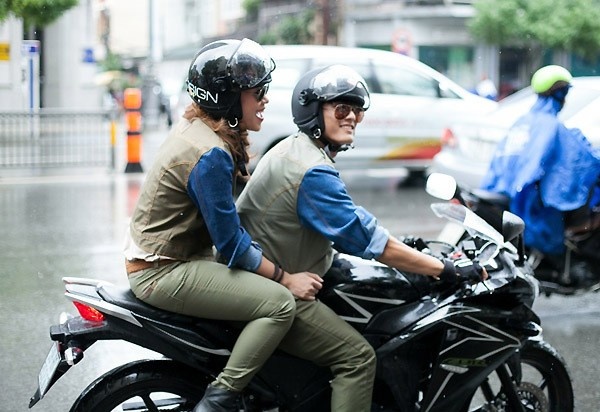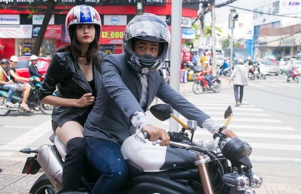 | Ngô Thanh Vân đang được truyền kinh nghiệm cách lái mô tô sao cho lên phim đẹp và oách nhất. |
