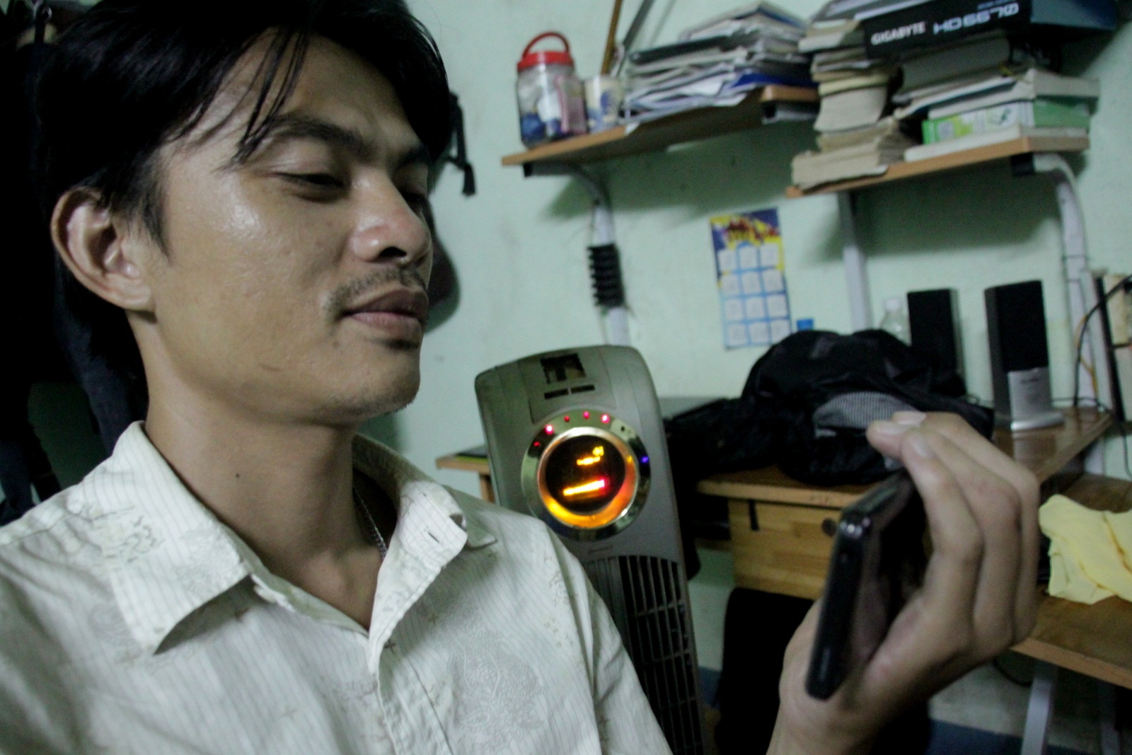 | Một số khác xem qua điện thoại có kết nối Wifi. Trong ảnh, Ngọc Thiện (CĐ Mỹ Thuật Đồng Nai) đang xem bóng đá quá điện thoại. |