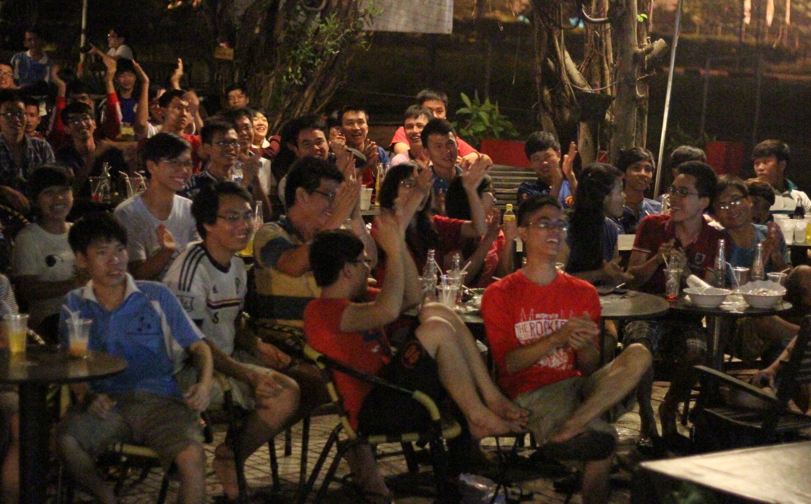 | Đến dịp World Cup, dù đang là mùa thi nhưng nhiều sinh viên, nhất là các bạn nam vẫn cố gắng sắp xếp thời gian để thức đêm xem bóng đá. Không khó để bắt gặp hình ảnh những quán cà phê bình dân ở làng đại học Thủ Đức luôn sáng đèn, lắp đặt tivi phục vụ sinh viên. |