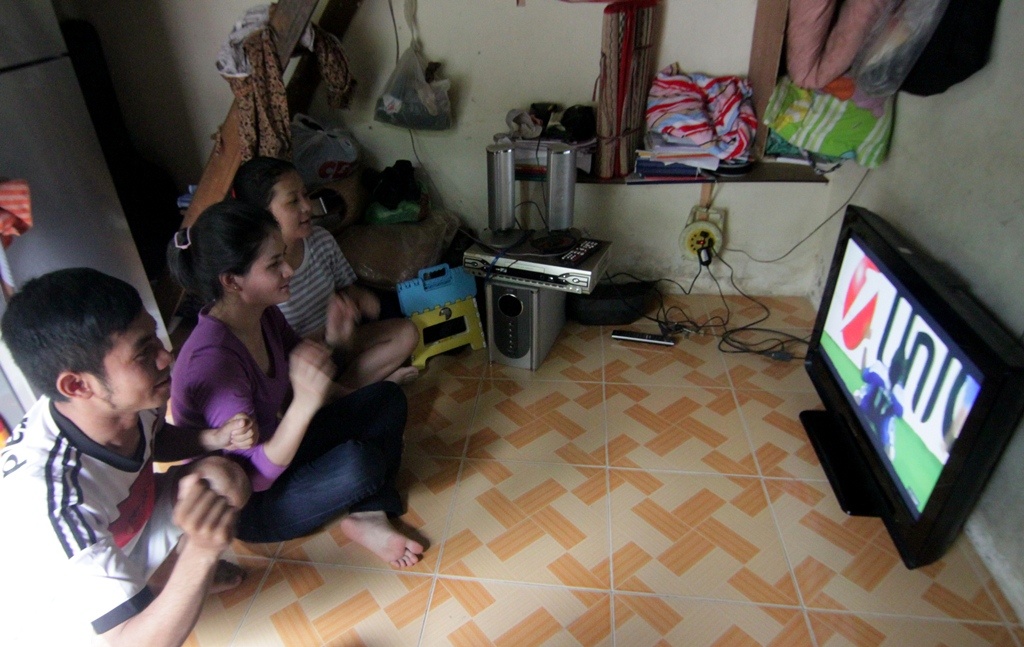 | Tại một dãy trọ trên đường D2 (Q.Bình Thạnh) chiếc tivi duy nhất trong xóm trọ thu hút các sinh viên cùng tới xem. |