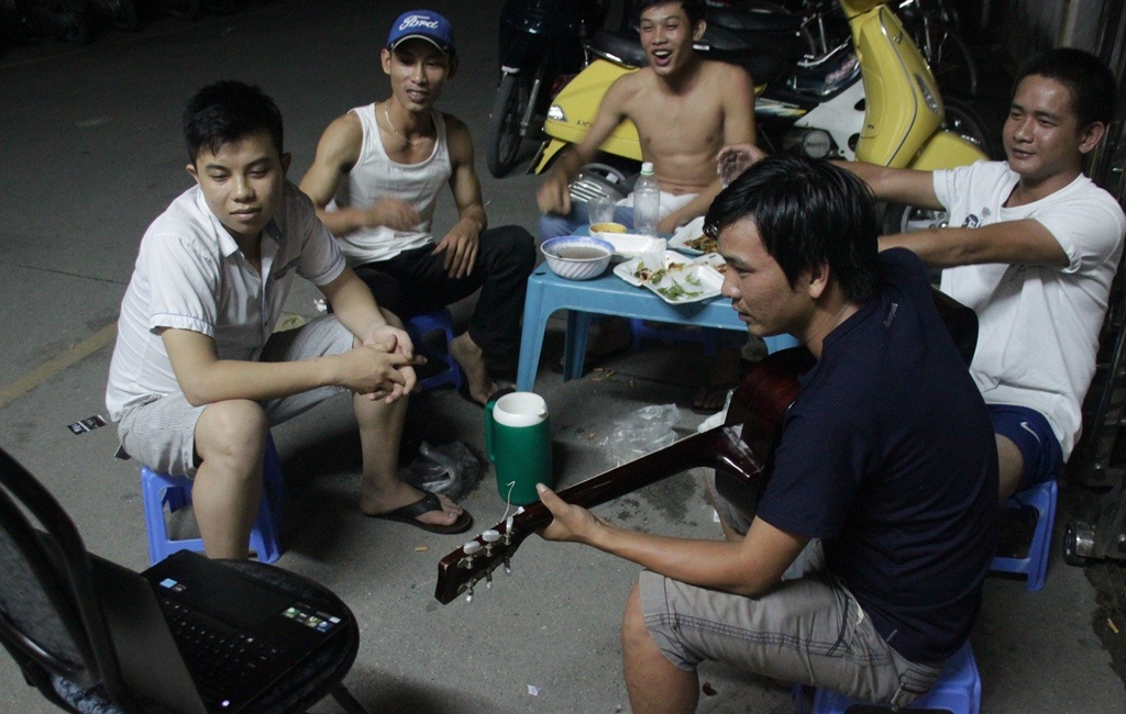 | Một nhóm nam sinh ở trọ tại chung cư Mỹ Kim (Q.Thủ Đức) mang laptop, guitar và mua đồ ăn về để cùng nhau thức đêm xem bóng đá. |