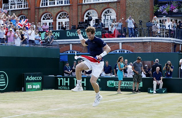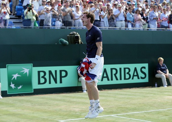 | Murray ôm mặt xúc động khi chính thức mang về tấm vé dự bán kết Davis Cup 2015 cho Vương quốc Anh. |