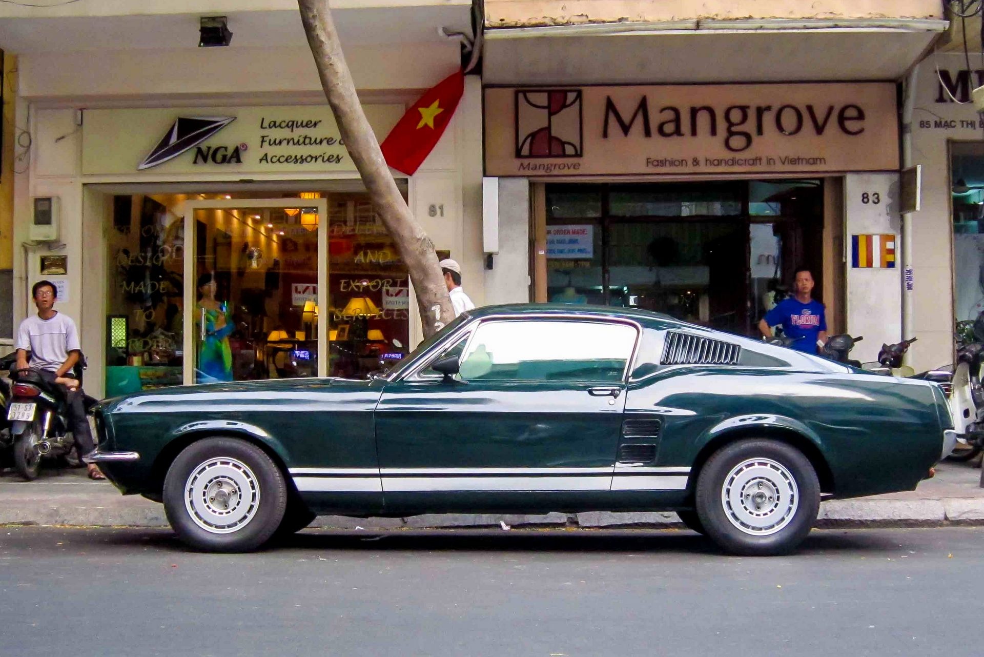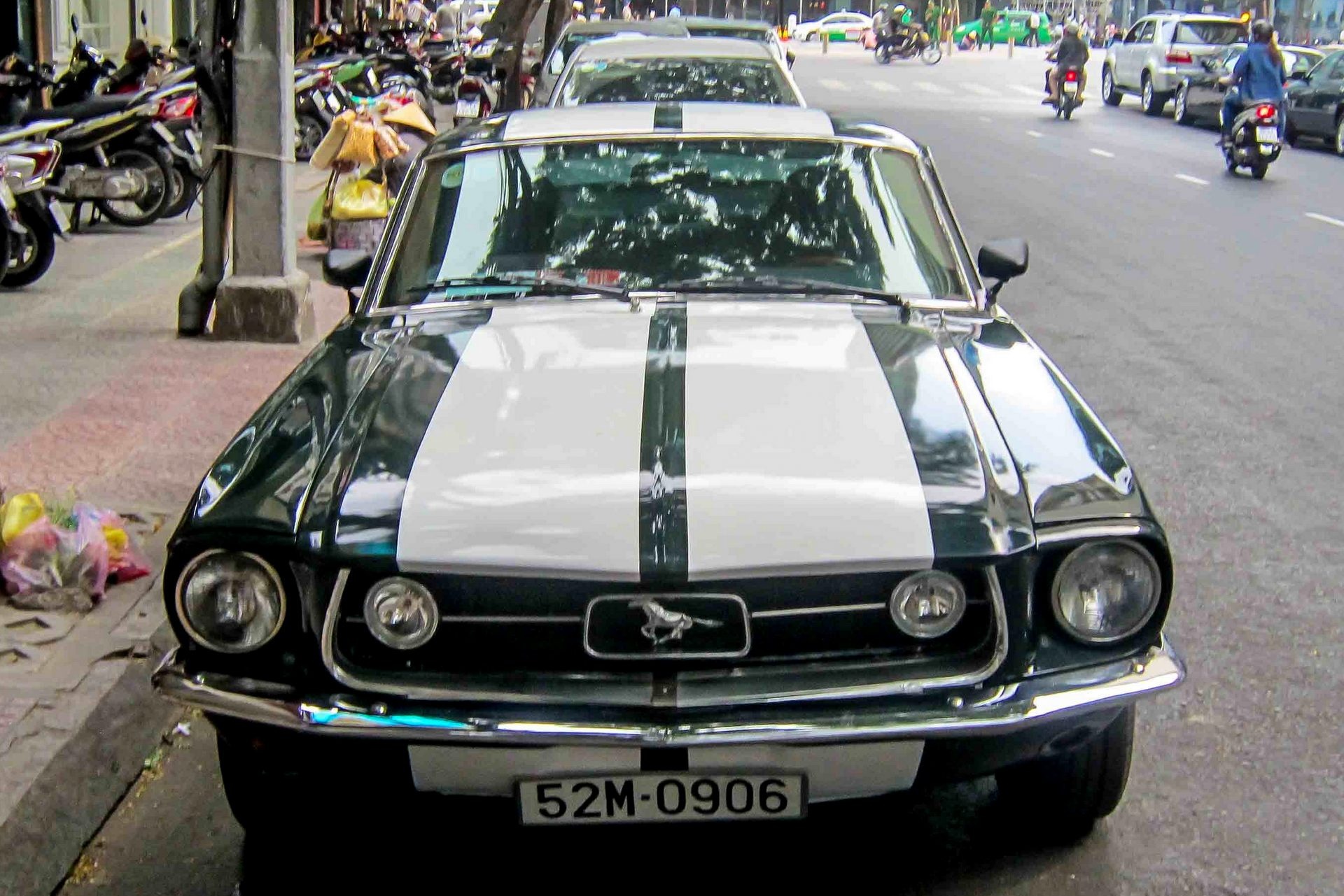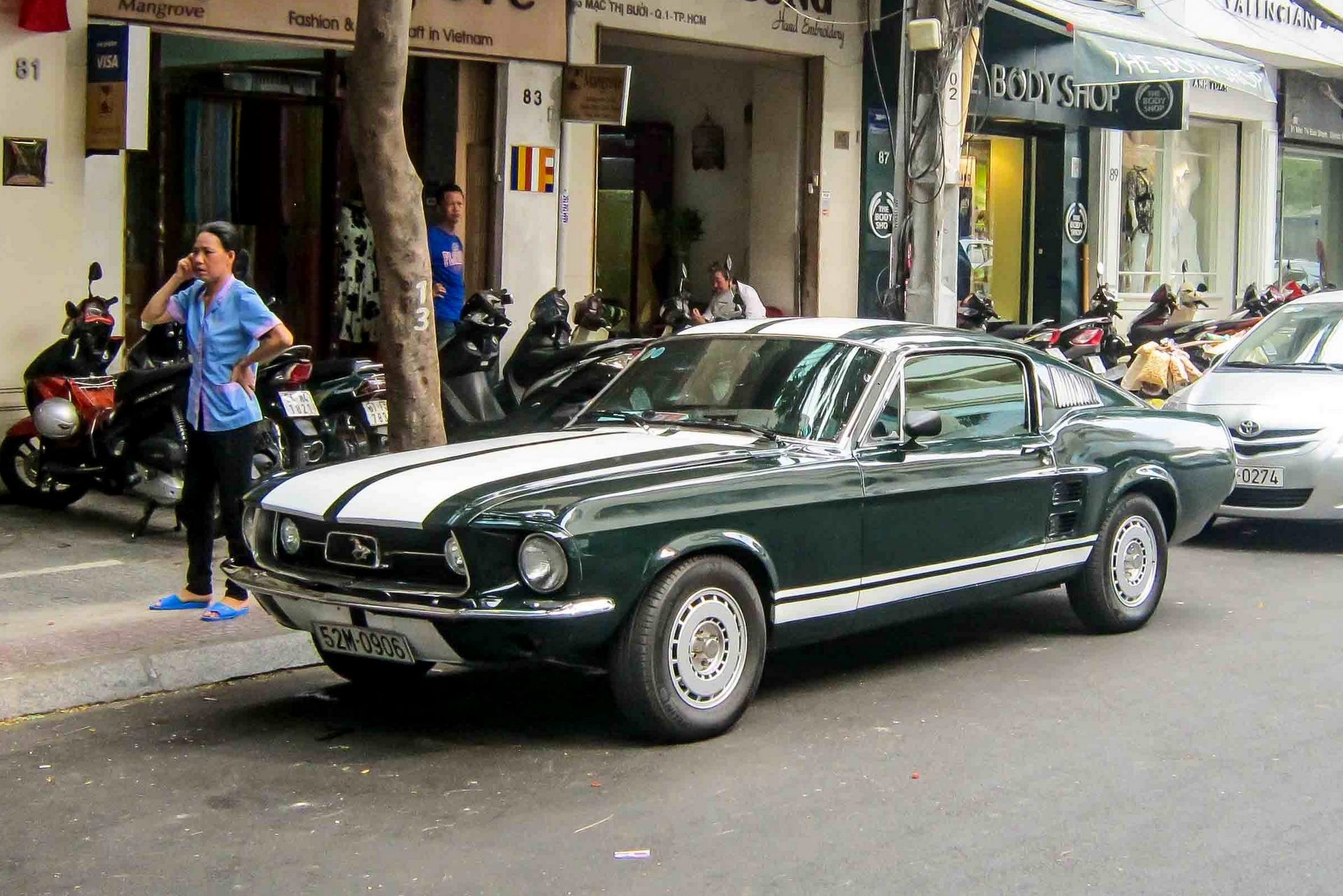 | Mới đây, một chiếc Mustang cổ độ lại khá giống mẫu xe trong phim được bắt gặp trên đường phố Sài Gòn. Trước đây, chiếc xe có màu đen nhám nhưng vừa được sơn lại theo tông màu xanh - trắng. |