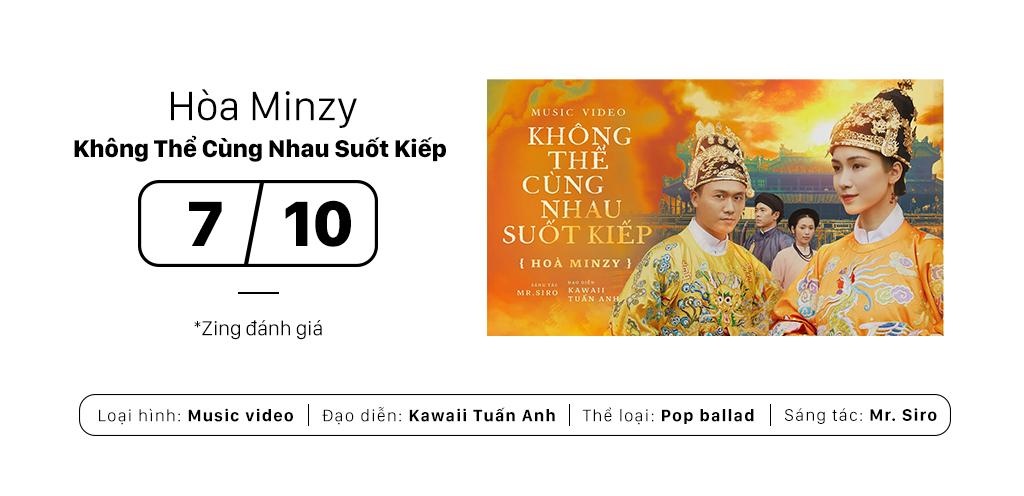 Sau thời gian tương đối dài im ắng trên thị trường âm nhạc, Hoà Minzy vừa trở lại đường đua Vpop với MV Không thể cùng nhau suốt kiếp. Thành phẩm được cho là đầu tư nhất về mặt tiền của trong chặng đường ca hát của giọng ca gốc Bắc Ninh.