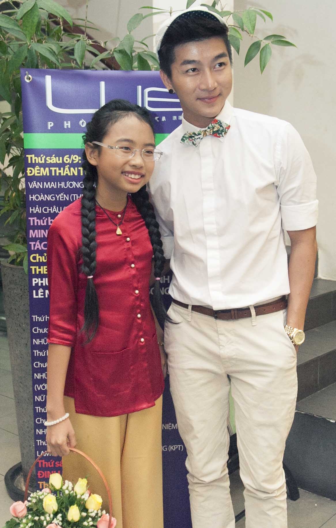 Phương Mỹ Chi xách giỏ hoa xinh xắn vừa được tặng tạo dáng bên MC của đêm nhạc Cám ơn.