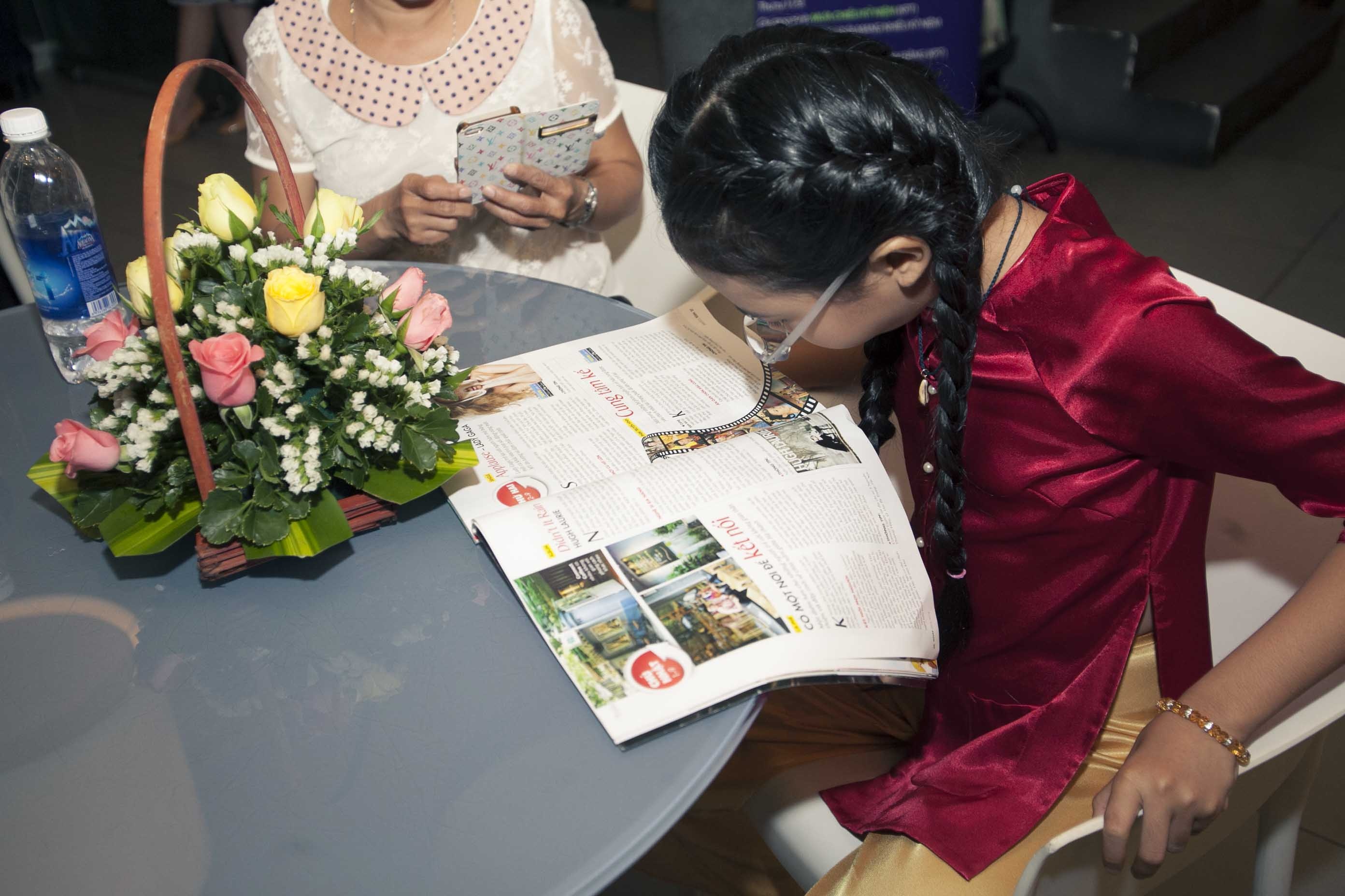 "Chị Bảy" tranh thủ đọc báo trong khi mẹ cô kiểm tra điện thoại. Gia đình tiết lộ từ khi tham gia The Voice Kids, Mỹ Chi nhận được nhiều lời đề nghị đi diễn nhưng mẹ cô đều từ chối vì muốn con gái dành thời gian cho việc học văn hóa ở trường.