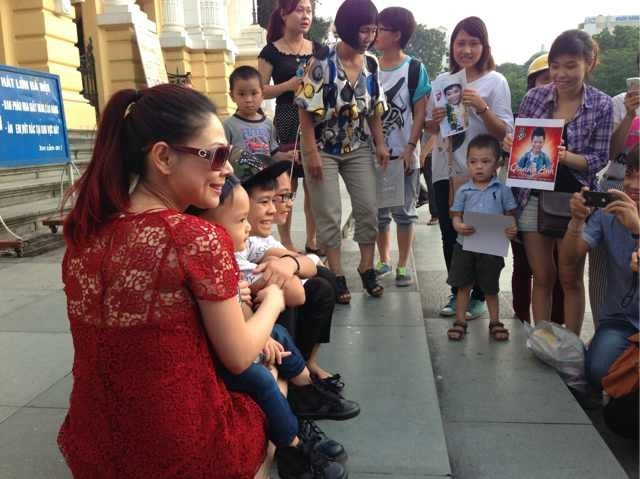 | Nhiều người hâm mộ đã tặng quà và xin chụp ảnh cùng 2 thí sinh nổi bật của The Voice Kids. |