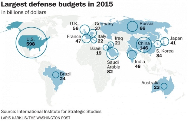 Theo báo cáo Tương quan quân sự năm 2016 được IISS công bố ngày 9/2, ngân sách quốc phòng Mỹ được ước tính khoảng 598 tỷ USD, gần bằng ngân sách quốc phòng của 14 quốc gia trong nhóm cao thứ hai cộng lại và lớn hơn nhiều so với các nước còn lại trên thế giới.