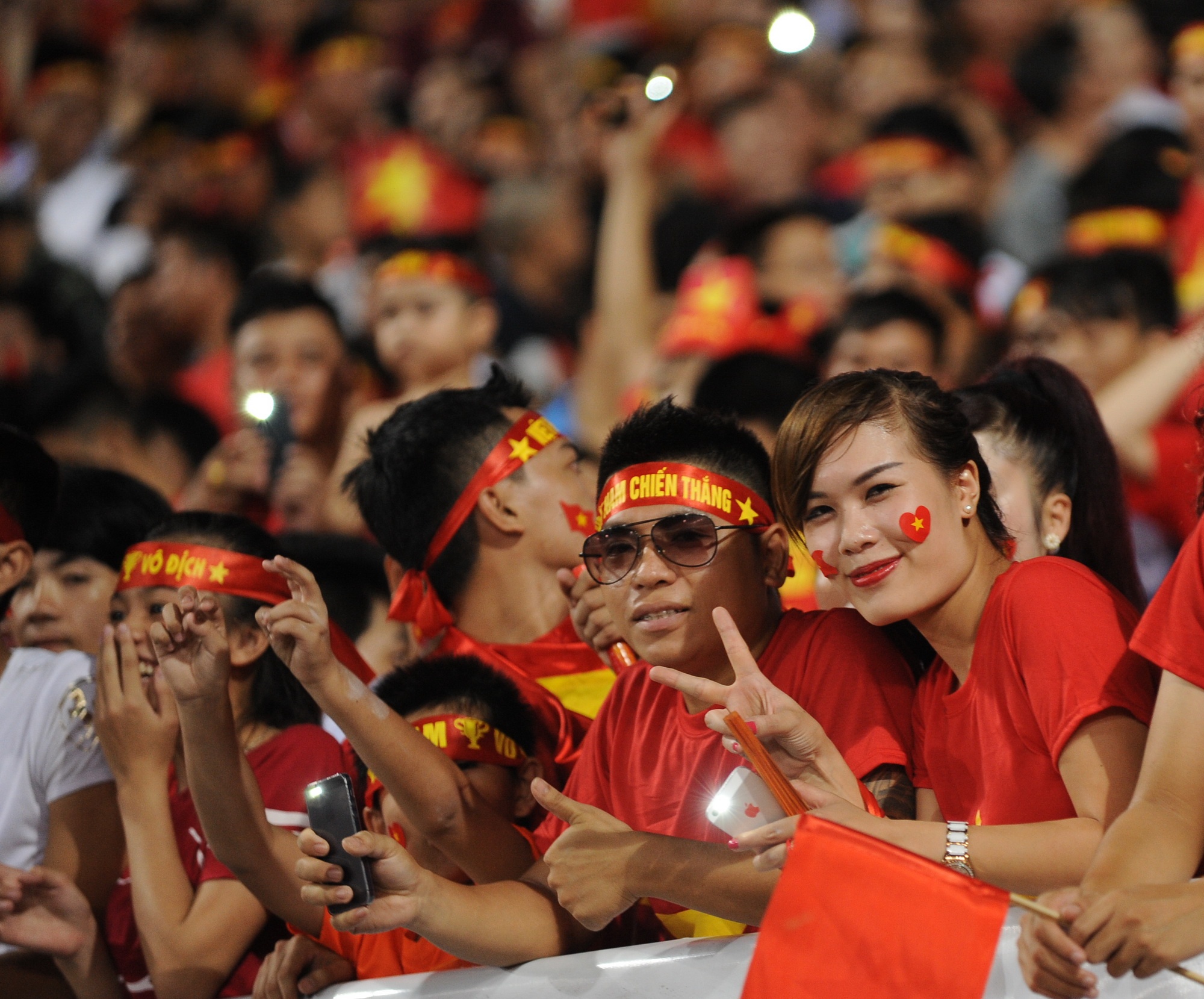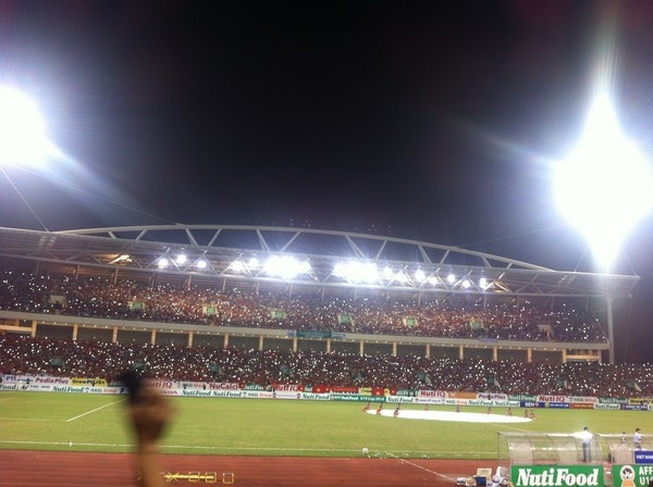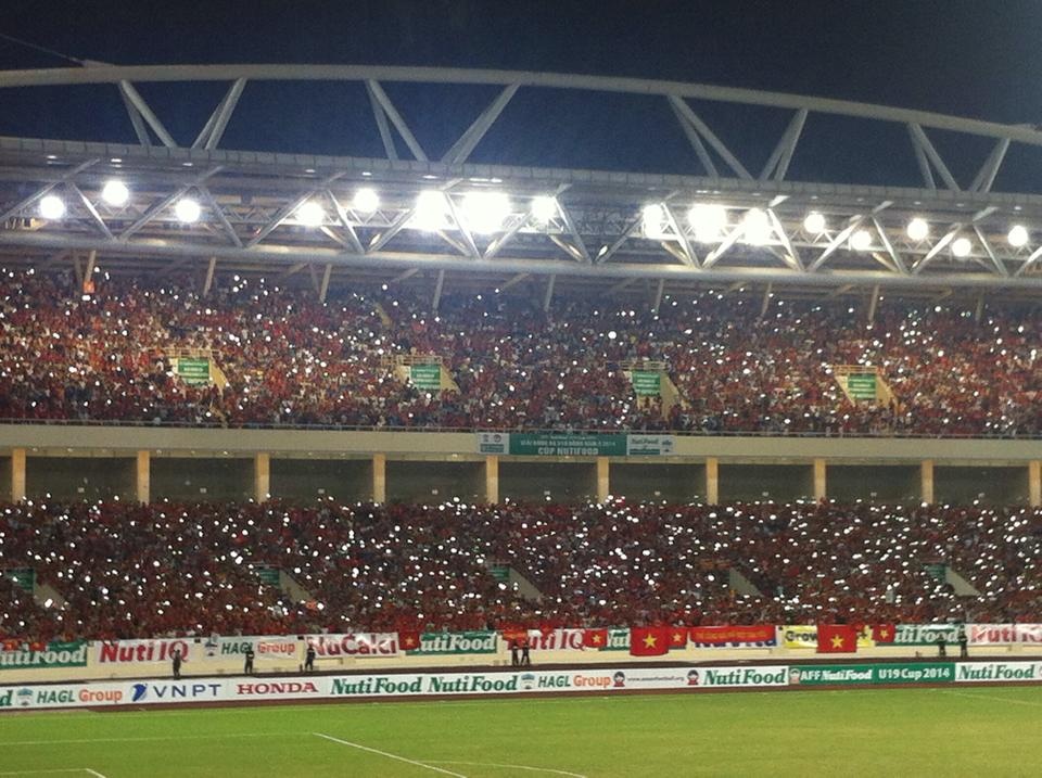 | Sân Mỹ Đình lung linh trong ánh đèn flash trước trận chung kết U19 Đông Nam Á. |