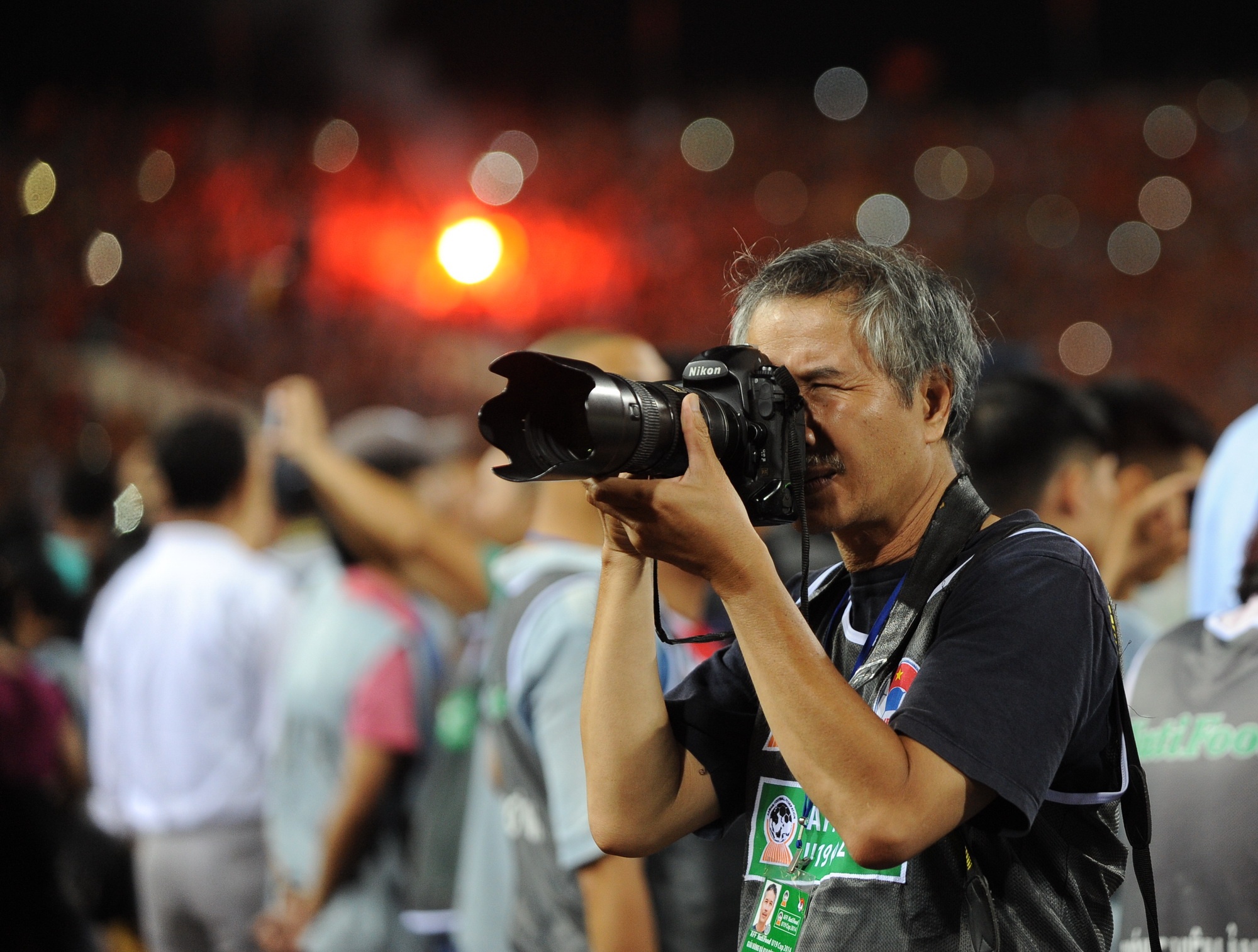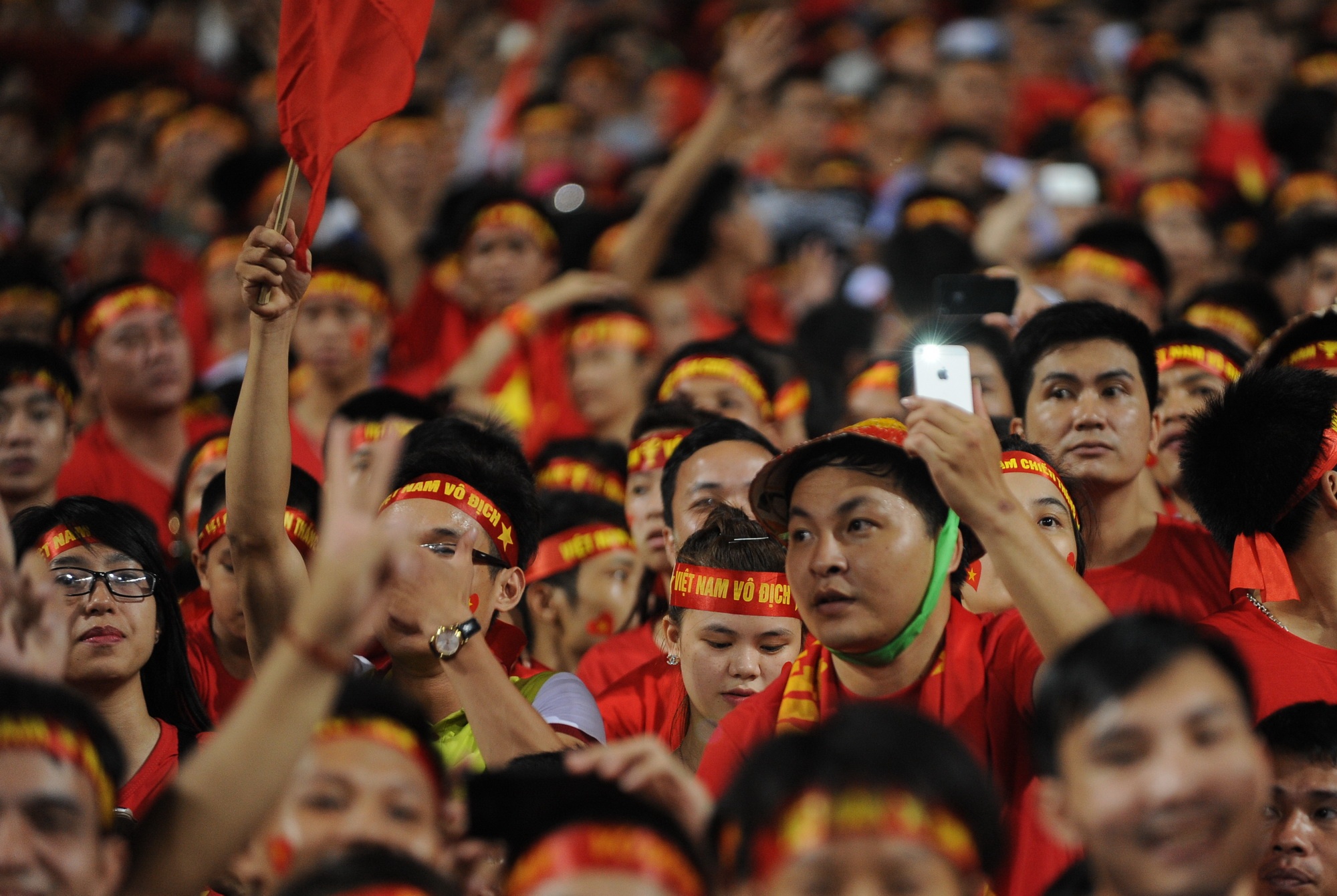 | Phóng viên ảnh của một hãng thông tấn quốc tế cũng thích thú ghi lại cảnh tượng đẹp lung linh trên sân Mỹ Đình. |
